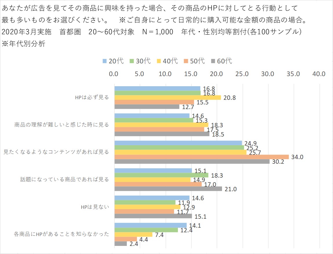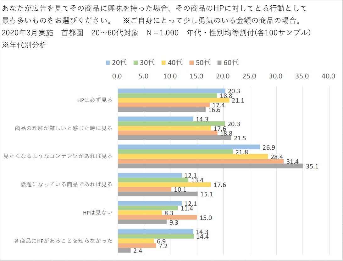 まず、当該アンケートにおいて「その商品が、ご自身にとって少し勇気のいる金額の商品だった場合」という条件を付けると、特に高い年代において「商品の理解が難しいと感じたときにHPを見る」と回答する率が高くなります。