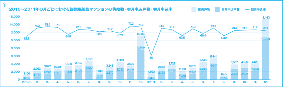 グラフ①は2010~2011年の月ごとにおける首都圏新築マンションの供給数・初月申込戸数・初月申込率を示したグラフだ。3.11の直後、4月の需要と供給を前年と比較すると初月申込戸数は46%、供給量は24%落ち込んでいることがわかる。しかし既に翌月の5月から復調の兆しを見せた。初月申込戸数は3%、供給量は14%前年比減であるが前月のダウン幅を大きく縮めている。そしてさらに翌月の6月では初月申込戸数も供給数も前年比増となり、そこから12月までは8・10月を除いた全ての月で初月申込戸数も供給数も前年を上回る結果となった。(8月は元々不動産需要が減ることに加えて東日本大震災年であったこと、10月は2010年に1,000戸弱の物件が発売したことが要因で前年比減)特に最終月の12月は初月申込戸数が28%、供給数は37%前年比増にまで至った。すなわち東日本大震災後の新築マンション需要は比較的早いタイミング(2ヶ月程度)でリバウンドする結果であった。