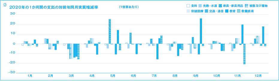 では他の業界における東日本大震災後の需要回復に要した時間はどれほどのものであったのか。グラフ②は1世帯当たり1か月間の支出の対前年同月実質増減率を表したものだ。このうち、基礎的支出(必需品)の業界である、食料、家具・家事用品の項目は大震災関係なしに例年通り、または前年比増で推移している。(光熱・水道は節電が謳われた年であるため年間を通して前年比減で推移)