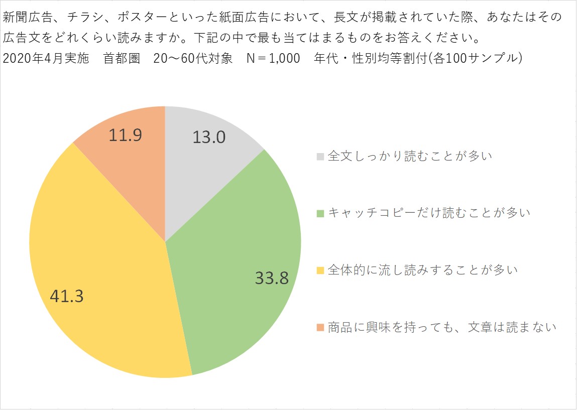 それを調べるために、「紙面広告において、長文が掲載されていた際、あなたは広告文を読みますか?というアンケートを実施しました。