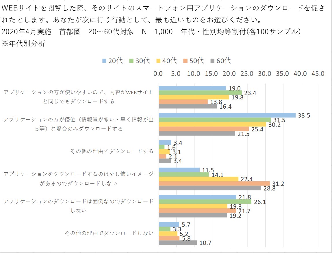確かにアプリはブラウザよりユーザー情報をより細かく取れ、情報を更新した際はプッシュ通知などもできるのでサービスを提供する企業側にもメリットが非常に多いということを考えると、これからアプリへのDL誘引が主流になる、、、とすると、こうした年代別の考え方を反映した流入経路を作っていくことが非常に重要になっていきますね。