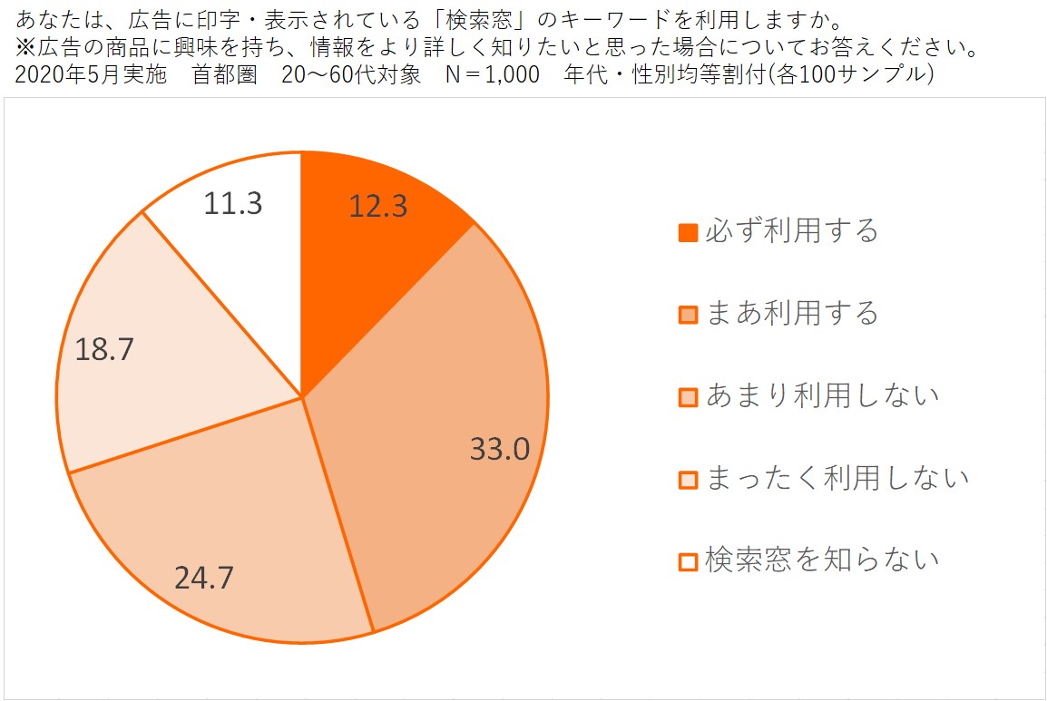 そこで、全国1,000人(20~60代)に対して、「広告を見て、その商品の詳細を知りたいと思った際、検索窓を利用しますか?」というアンケートを実施しました。