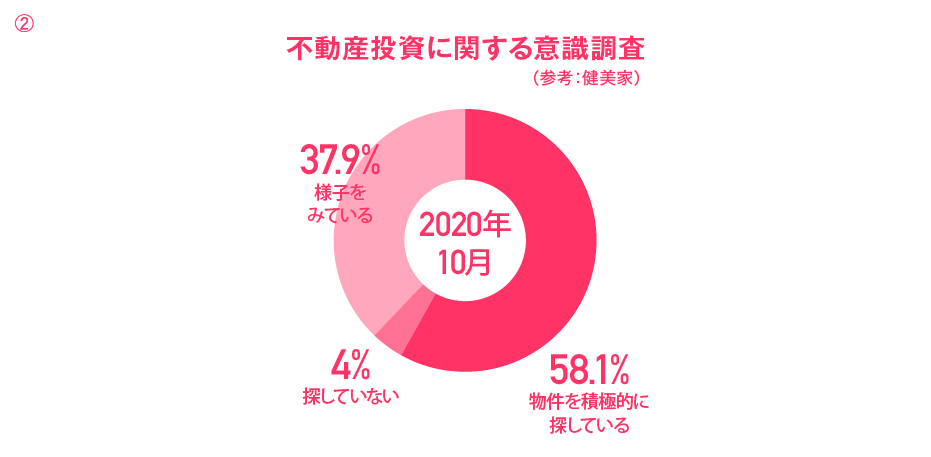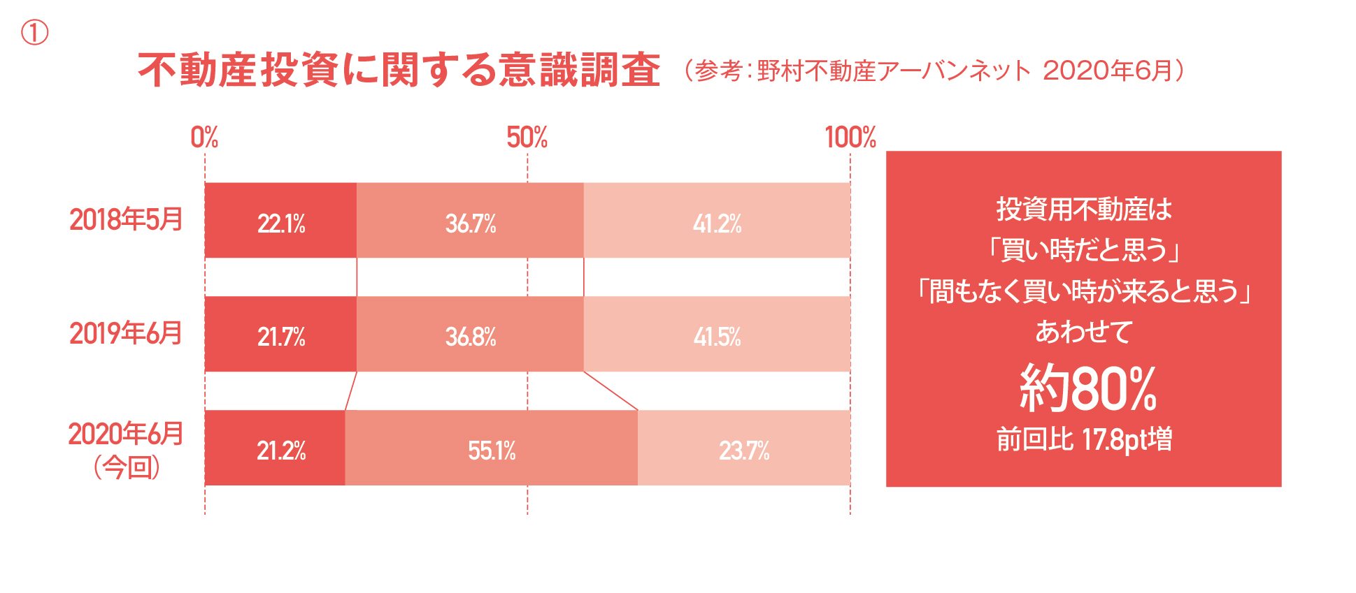 新型コロナウィルスが感染拡大して以降、世間では「アフターコロナ」というワードをよく耳にしたが、この未来はまだ先になりそうだ。緊急事態宣言解除後も第2波・第3波と続き、コロナ禍は2年目を迎えようとしている。そんな感染拡大が長期化する中で不動産投資に注目が集まっている。その証拠に2020年6月に野村不動産アーバンネットが調査した意識調査によると「今、投資用物件は買い時だと思いますか?」という質問に関しては2019年より17.8pt上回る約80%の人が「買い時」或いは「間もなく買い時」と回答。(参考:グラフ①)さらに投資用不動産ポータルサイト健美家の調査にて「現在物件を探していますか?」という問いに約60%の人が「物件を積極的に探している」と回答し、「様子を見ている」と回答している人を上回る結果となった。