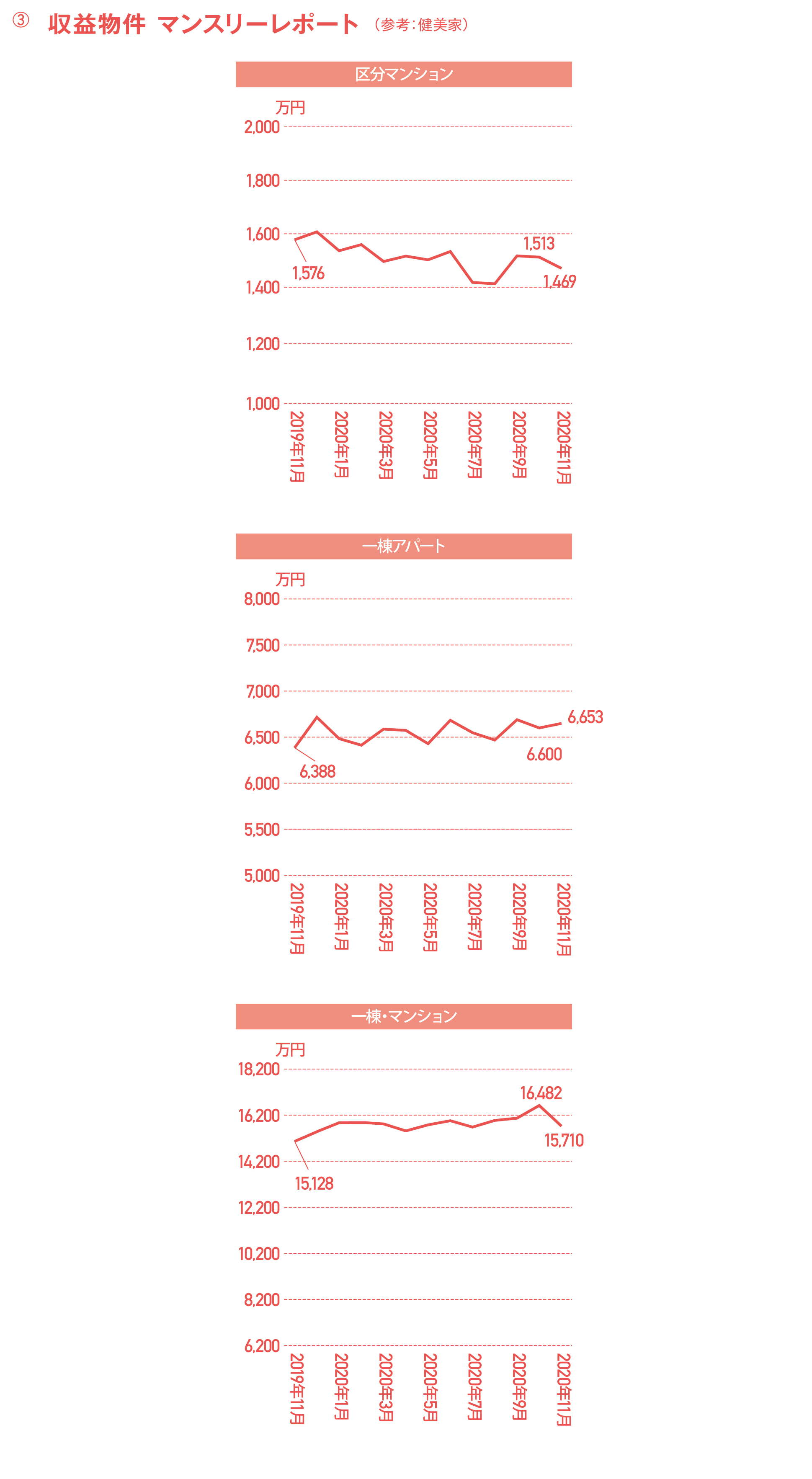 では需要の高まる要因となった不動産価格の安定性は実際に結果として表れたのだろうか。グラフ③は区分マンション・一棟アパート・一棟マンションの価格推移だが、区分マンションのみ年間を通して下落傾向にあるものの全体的に2020年3~4月より大きく変動していない。