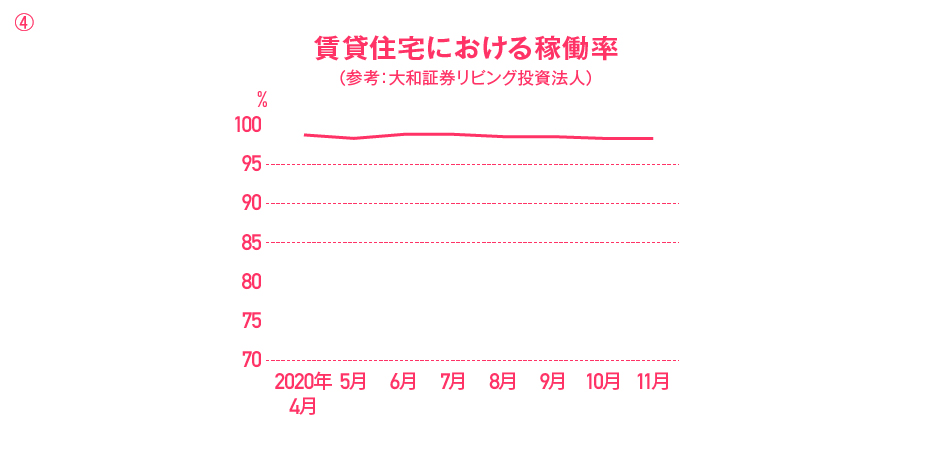 さらにグラフ④は賃貸稼働率の推移を表したものだが2020年4月から11月まで90%後半で変わらず安定して推移しており、安定性が見て取れる。この結果は政府からの住宅確保給付金の影響も大きいだろう。
