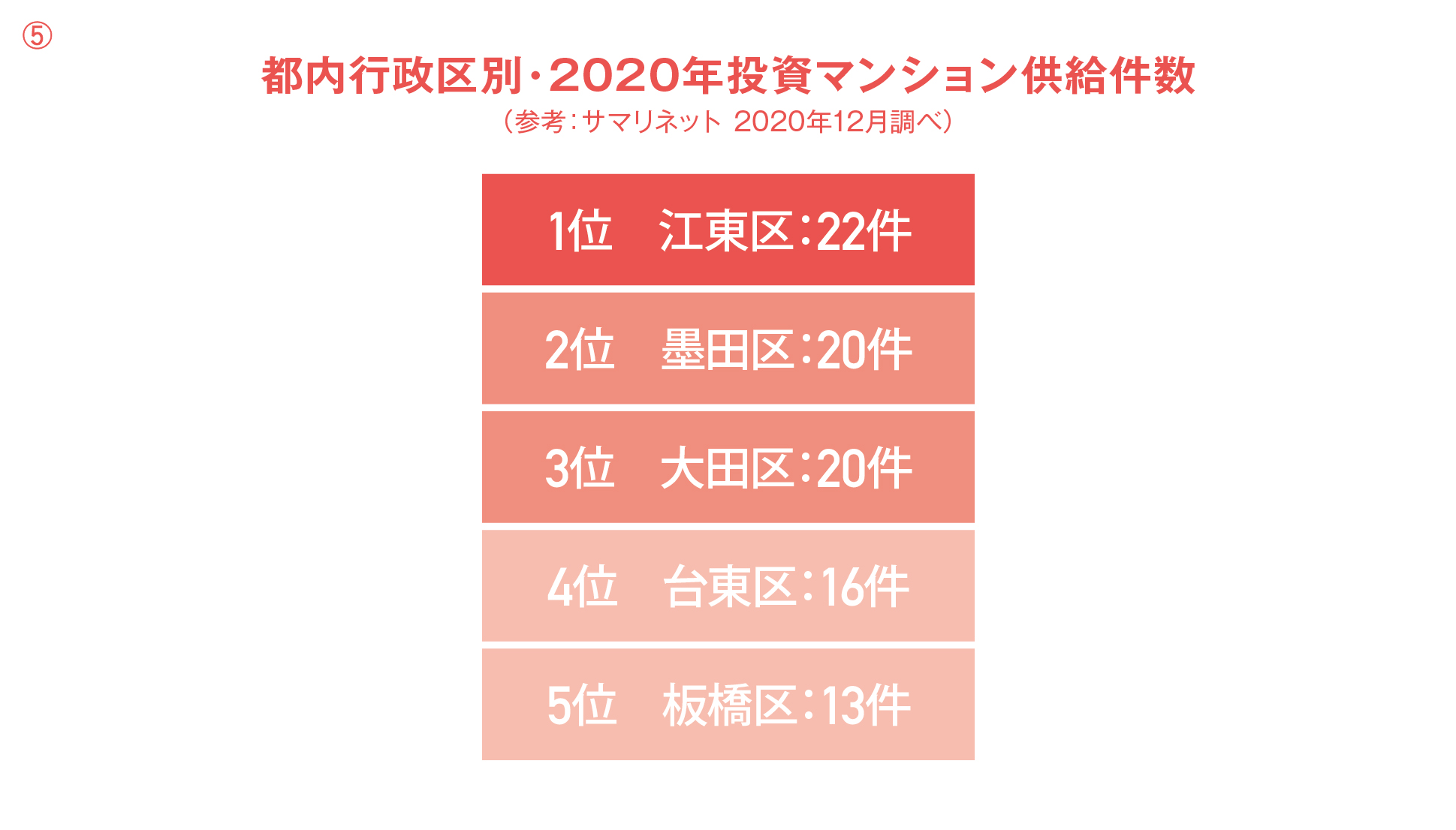 そんな不況に強い不動産投資だが、続いて今後狙い目となるエリアに話を移していきたい。2020年の投資マンションの供給件数を見ると都内で最も供給が多いのは江東区だ。(参考:表⑤)