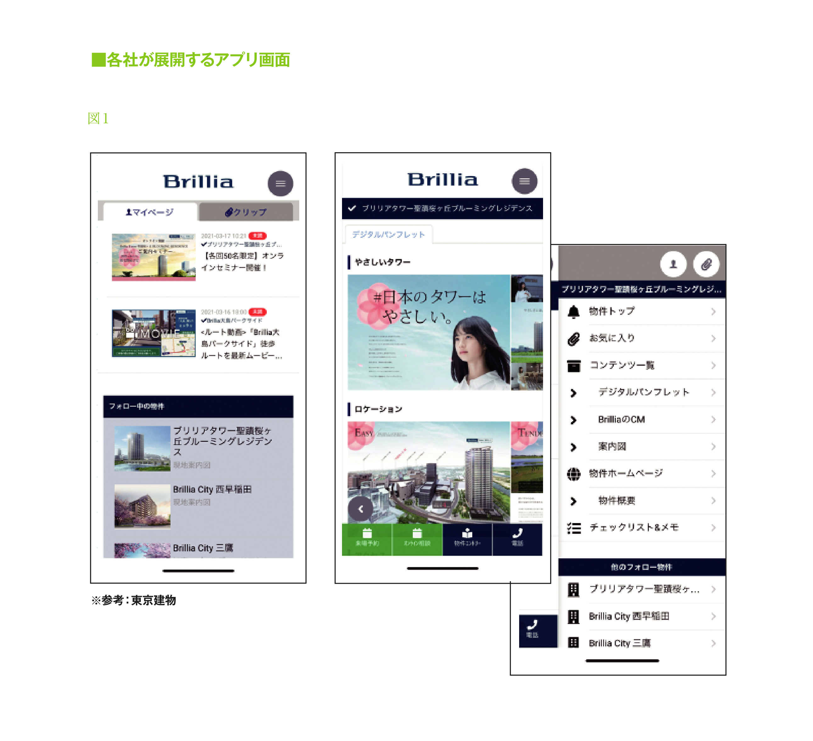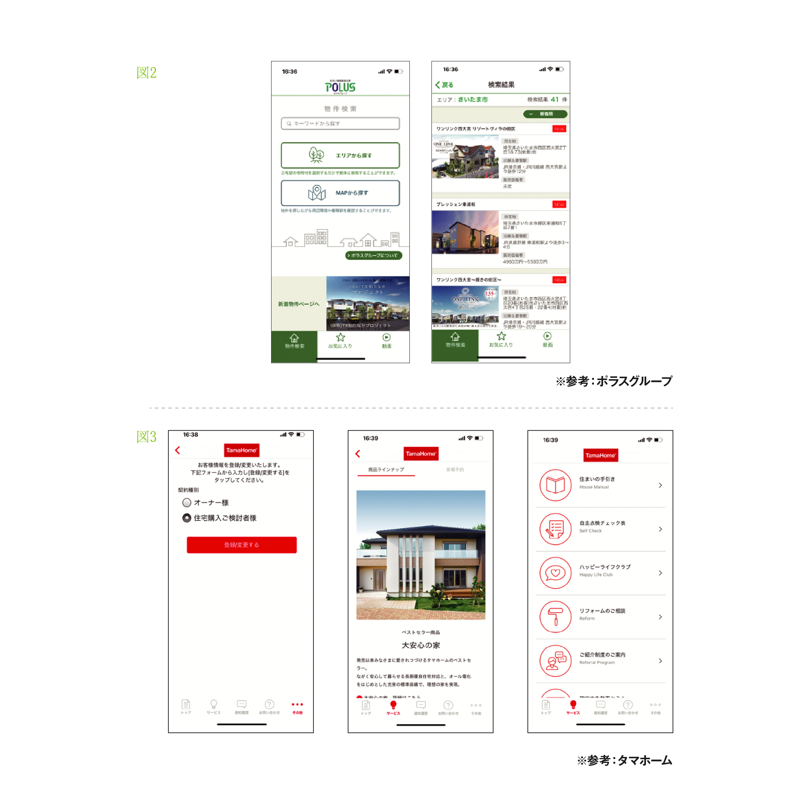 ではそんな売主が提供しているアプリの中でも他売主と違いが見られる事例はあるのだろうか。一般的にマンションデベロッパーでよく見られるものは図1のようなものだ。トップ画面に自分のチェックしたい物件情報が並んでおり、メニューからは間取りやパンフレットなどの情報が閲覧できる形式のものとなっている。しかしそれ以外でも同様の不動産業界で見ていくと戸建てを中心に展開する図2の2社のアプリは他の売主とは違う特徴を備えている。