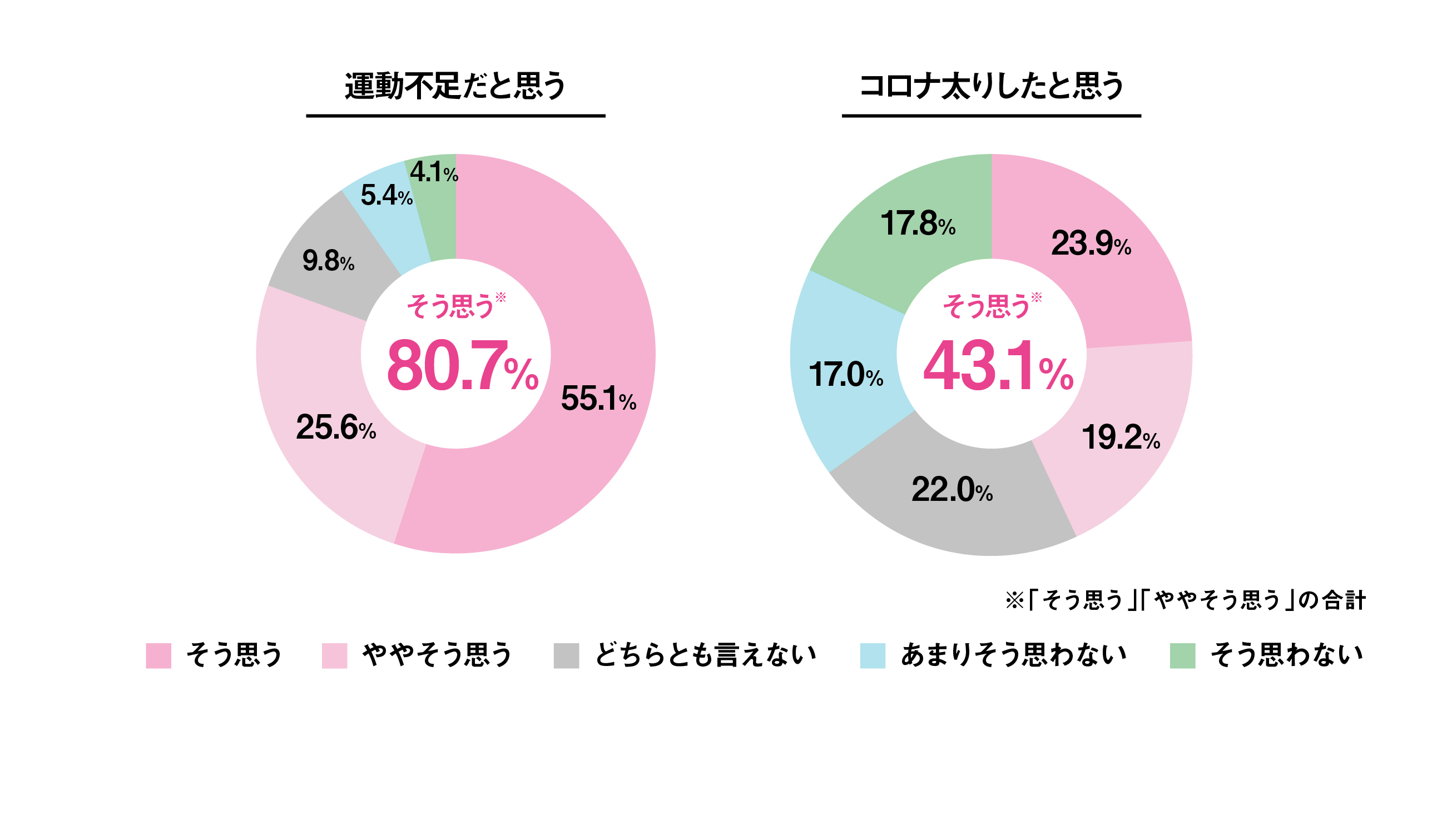 グラフのようにコロナにより運動不足を感じているのは約8割、コロナ太りしたと感じているのは約4割という結果となりました。