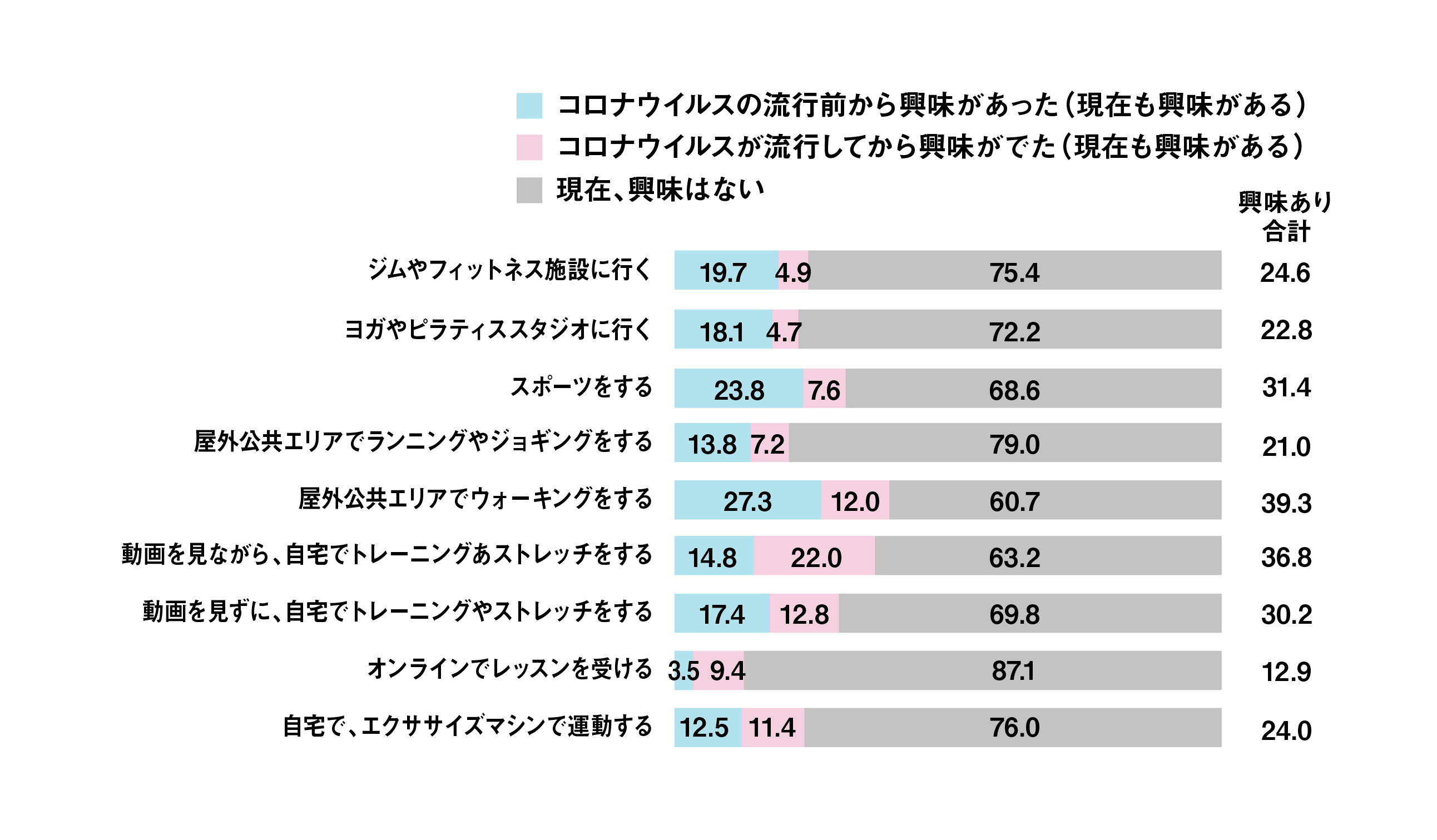以下のグラフは「各運動に対し興味があるか。ある場合、新型コロナウイルス流行前からか、流行し始めてからか」の回答を集計したグラフです。