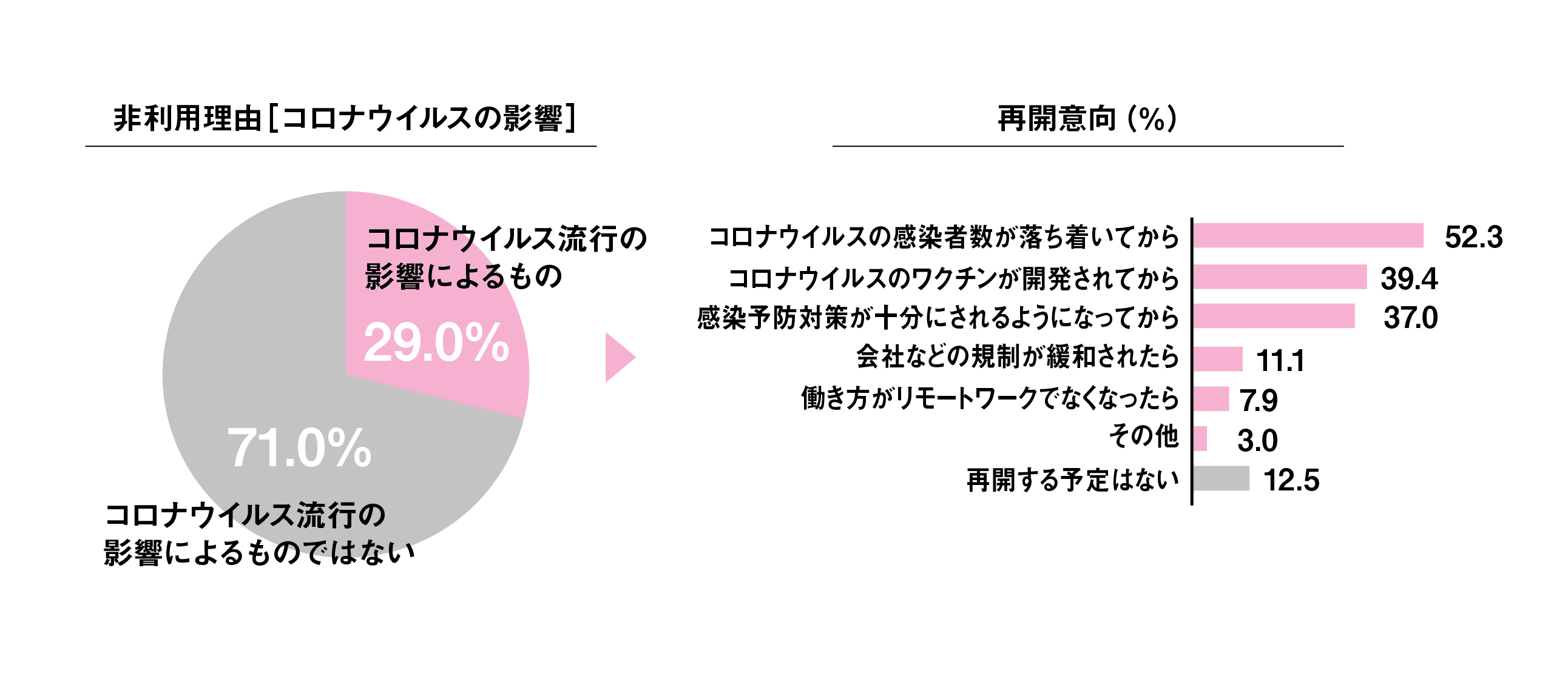 結果にも出ているように約7割が「コロナウイルス流行の影響によるものではない」、約3割が「コロナウイルス流行の影響によるもの」と答えました。再開の意向について聞くと、最も多い回答は「コロナウイルスの感染者数が落ち着いてから」が約5割。