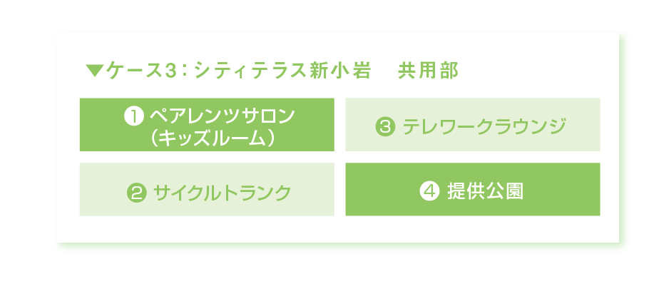 3物件に見られたテレワークラウンジは仕事をする上でメインの利用になるわけではないが、実際の需要もあり、特に企業内情報・会議等の理由から完全個室や半個室などのパターンがあるテレワークラウンジ需要が高い。 キッズルームについては共用部ならではのメリット(同マンション内の子どもたちが集まったり、ママ友が出来る)があるものの、子どもを持たない世帯や子どもが大きくなった世帯からすれば使用する機会はなくなり、既述した維持費の問題が出てきてしまう。こういったライフスタイルの変化によって使用の有無が変わってくる設備についてはコストと捉えることもできる。共用施設が充実し始めてから10年ほど経過し、様々なバリエーションが出ている中、「維持費問題」に目を向けるユーザーも多くなった。