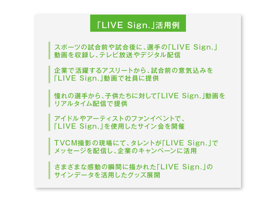 「LIVE Sign.」は、映像に直筆でサインを書ける、新しいサインの形。コロナ禍の今、なかなか実現することが難しい「セレブリティに直接サインを書いてもらう」という行為を、デジタル上で付加価値を高めて実現できる電通独自のサービスで、タブレットに書いた「サイン描画」とサインを書く「セレブリティの様子」を瞬時に合成し、動画コンテンツ・サインデータ化することが可能。コロナ禍により物理的距離を取らざるを得なくなったセレブリティとファンに対して、「いつでも」「どこでも」「誰でも」動画でサインを提供することができる。