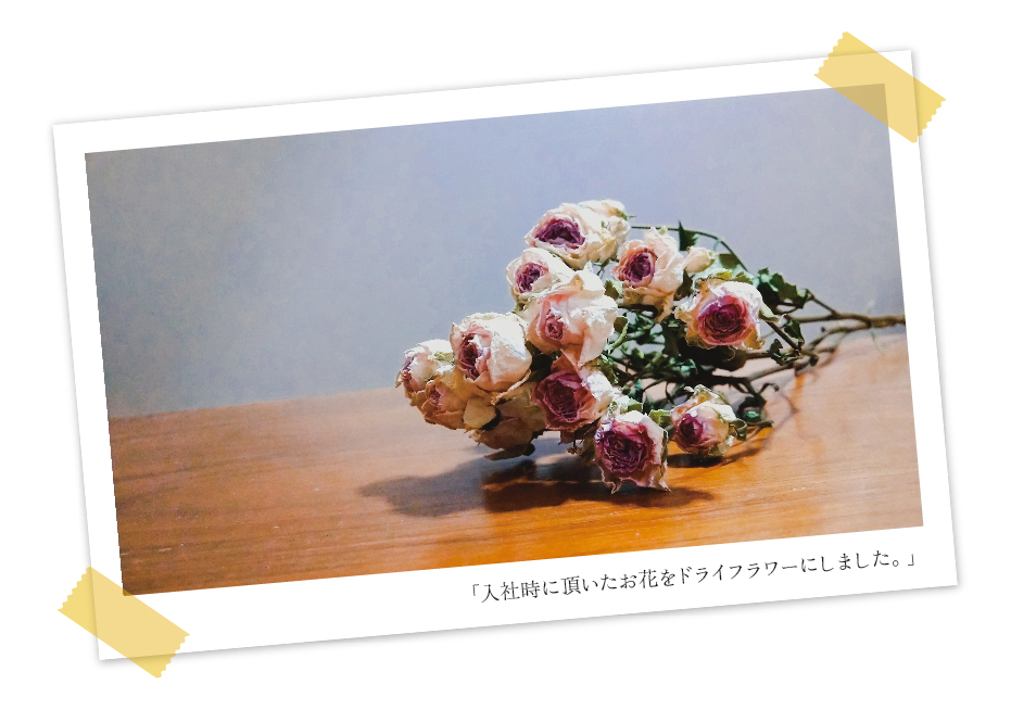 入社式の時に頂いたお花も立派なドライフラワーになりました。これを見習って、私も良い経年変化を遂げられるように日々頑張ります。