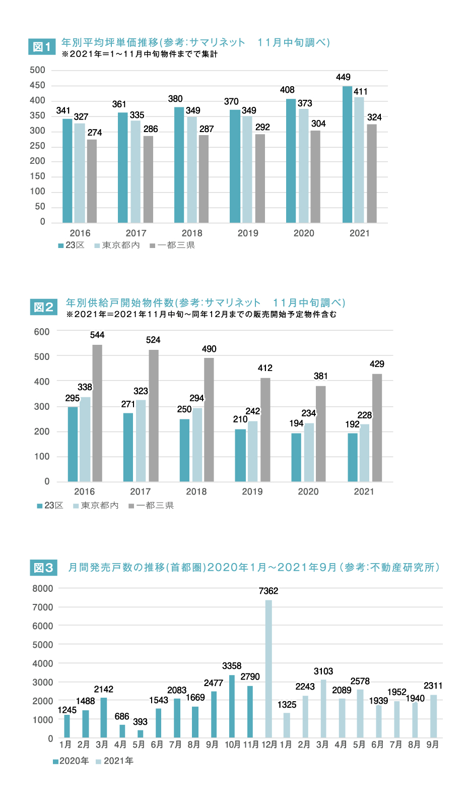 2021年は延期されたオリンピックの開催や新型コロナウイルスのワクチン接種など、2020年から様々な面で「前進」を感じるように思う。それでは新築マンション事業はどのように変化したのか。まずは年別坪単価推移(図1)だが、東京23区では昨年と比べて約10.1%の上昇。同様に東京都内で約10.3%、一都三県で約6.6%の上昇となった。例年と比べて差はあまり見られず、マンション価格は高止まりが続く。次に供給戸数推移では23区で約1.0%減、東京都内で約2.6%減、一都三県で約12.6%増となった。例年、首都圏供給戸数は減少の一途をたどっていたのだが、一都三県で供給戸数が増加。これは、新型コロナウイルスによる郊外化の需要が影響していると考えられる。