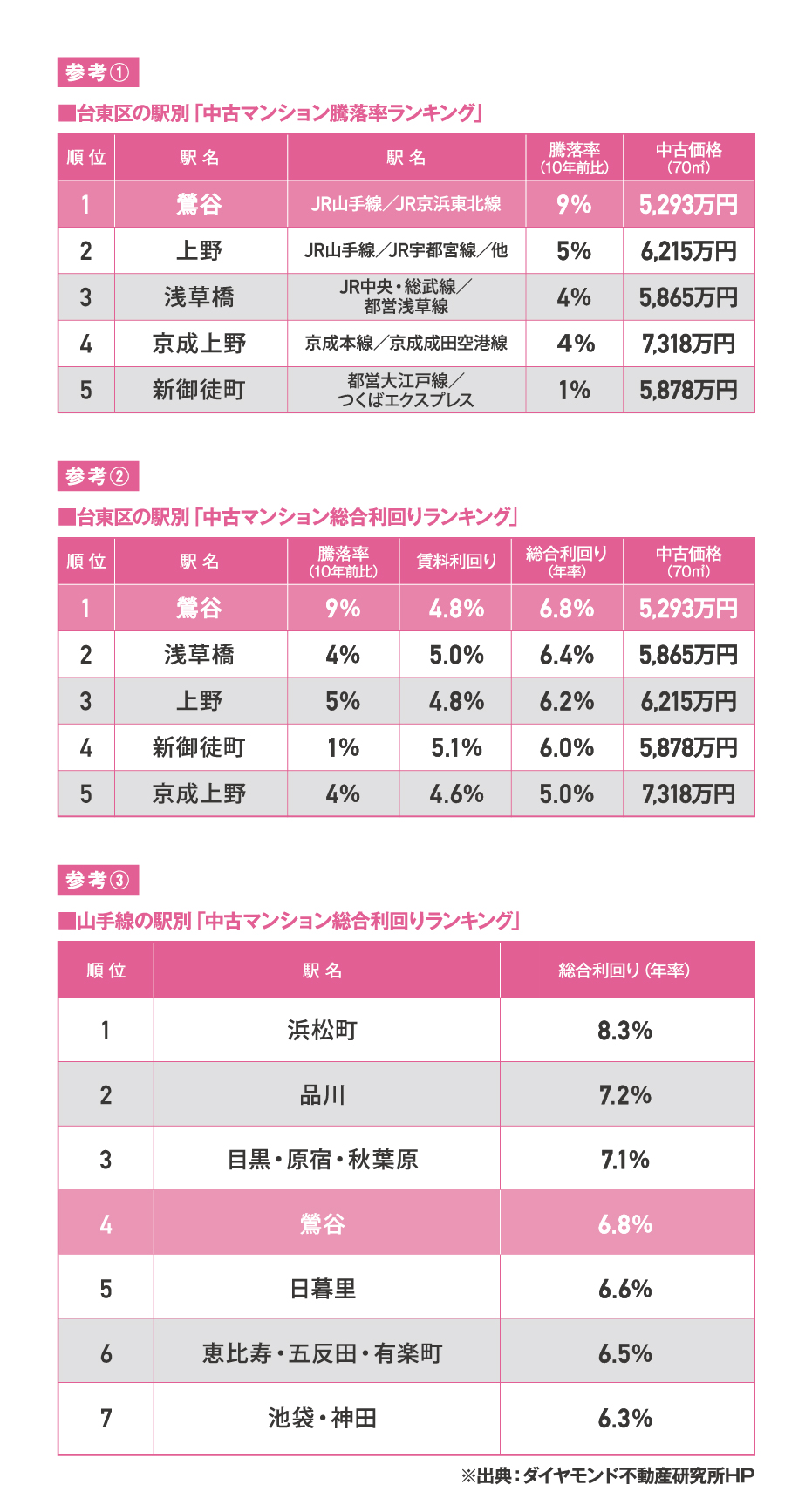 中古マンション価格騰落率の第1位は「鶯谷」駅で9%上昇となった(参考①)。