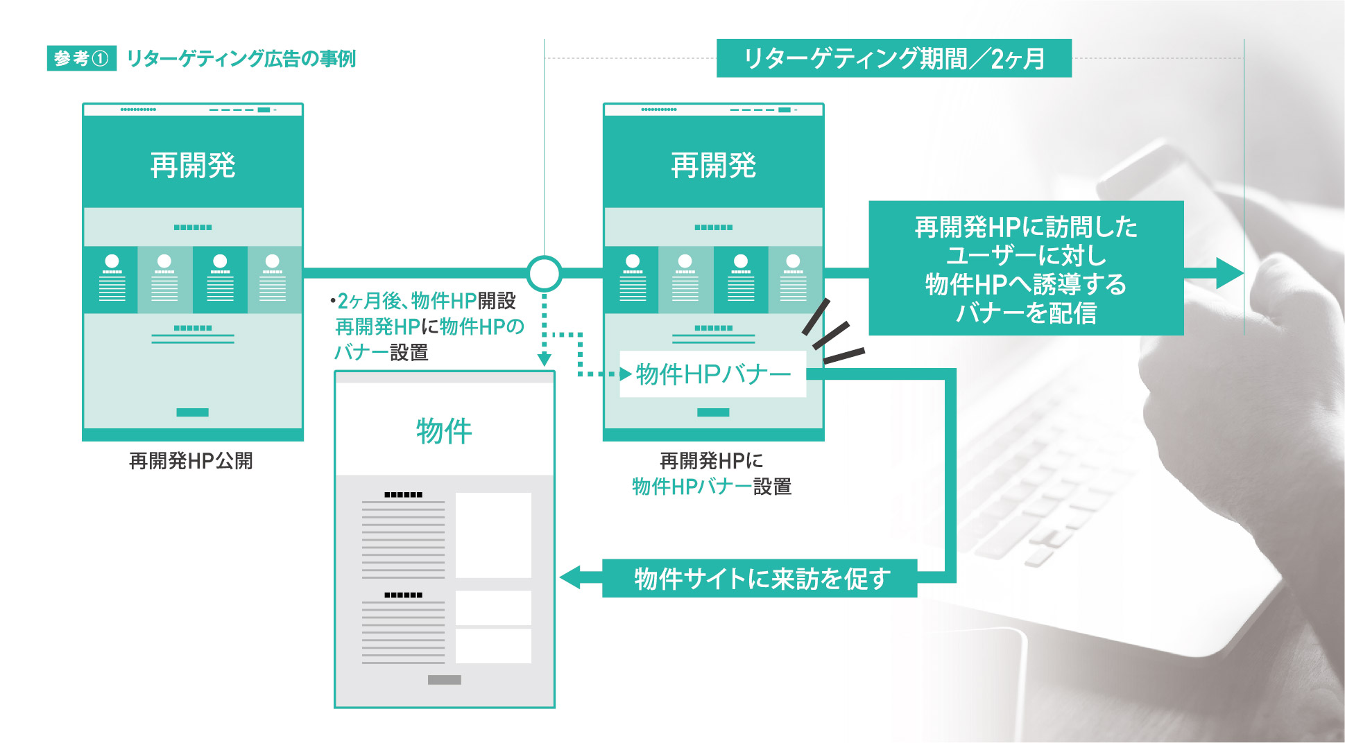 物件の広告が打てない時点で先行して再開発サイトを公開し、顧客の再開発へのマインドを育てる。2か月後、物件HPを公開したタイミングで再開発サイトに過去訪問した顧客に対してリターゲティング配信を行い、再開発街区内に分譲宅地が販売される旨を周知するといった流れである(参考①)。