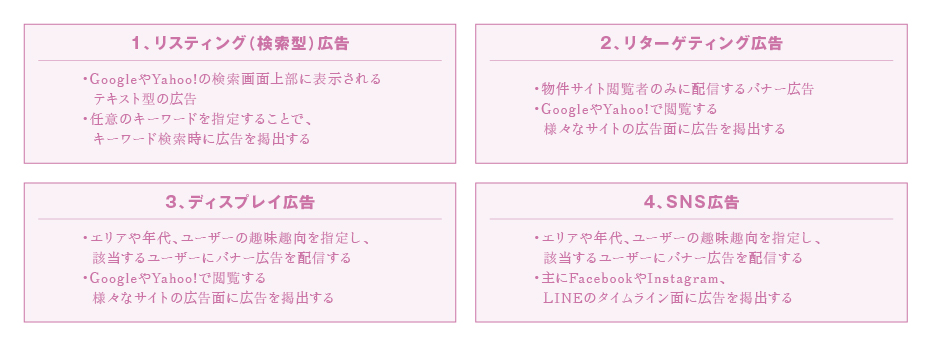 不動産広告において主流となるweb広告は下記の4種類程度が一般的だろう。※ディスプレイ広告はバナー広告を配信する手法の総称となるが、本記事においては下記で定義する。