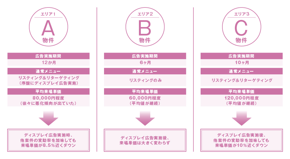 もともと来場単価が良いものに関して、「さらに向上させる」というところまでは至らなかったが、リスティング・リターゲティングだけでは広告効果があまり良くなかった案件や、徐々にweb広告の効果が下がってきている案件においては、ディスプレイ広告の効果が見られた。