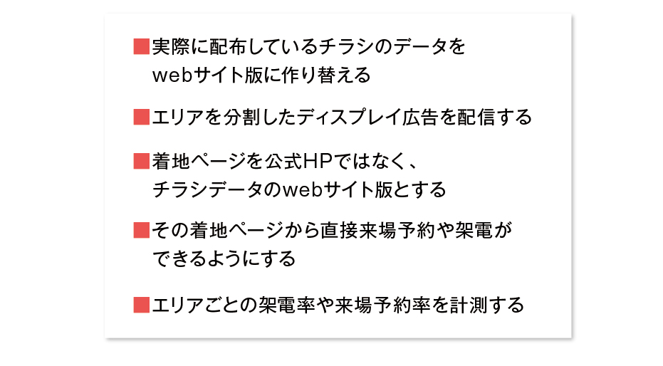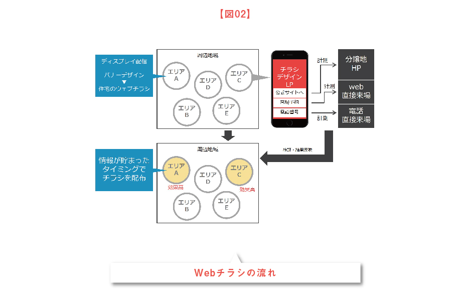 また、この配信・計測手法には、「チラシ配布エリアのテストマーケティング」も兼ねており、配信後のエリア別の効果を測定することで、「チラシをどこに配布すれば効果が見込めるか」のテストも可能となっている。