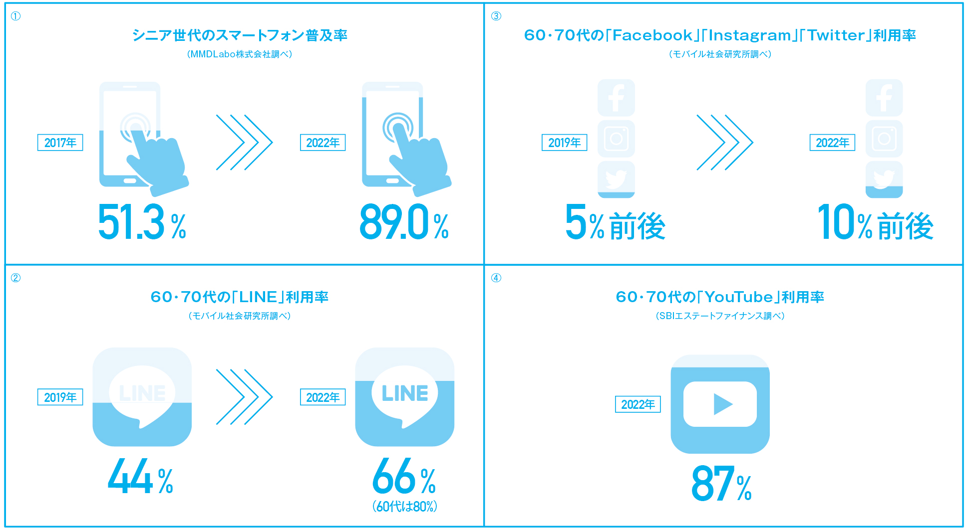 では未だにシニア層は従来の集客手法が適切なのか否か、まずはデータを元に検証していきたい。そもそもスマホの普及率についてMMDLabo株式会社によるとシニア世代のスマートフォン所有率は2017年では51.3%であったのに対し、そこから年々右肩上がりで増加。2022年の調査では89.0%の人が所有していると回答している(表1)。次にスマートフォンを利用したサービスの利用率について見ていきたい。モバイル社会研究所によると60・70代のうち「LINE」を利用する人は2019年時点では44%だったのに対し、2022年では66%にまで増加(表2)。うち60代に至っては80%の人が「LINE」を利用していると回答(表2)。