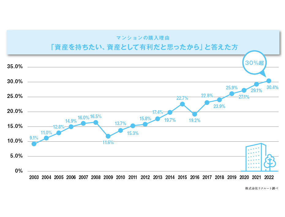 現在のマンション購入の要因として、資産価値を求める層が年々増加している。株式会社リクルートが毎年調査している首都圏新築マンション契約者動向調査によると、マンションの購入理由として「資産を持ちたい、資産として有利だと思ったから」と回答している人は年々増加傾向にあり、2022年には全体の30%が回答。