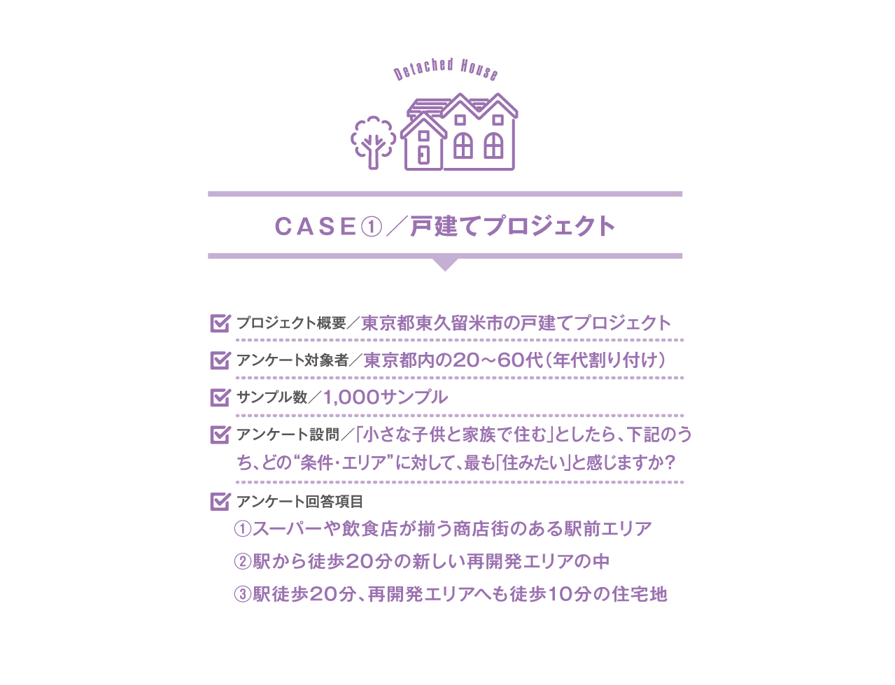【CASE①】は東京都東久留米市の戸建てプロジェクトで実施したアンケートだ。当プロジェクトは東久留米市の再開発エリアの中に誕生する戸建て開発であったため、多くの反響を呼んだ。しかし調査当初は当プロジェクトにおいて集客がしっかりできるのか不安視する声もあった。なぜなら当プロジェクトは駅から離れたエリアに誕生し、実際に近傍の戸建てプロジェクトの集客は芳しくなかったためだ。しかし、実際に近傍プロジェクトと違って当該地は再開発エリアの中に誕生するため需要もしっかりあるのでないかと推測し、その仮説を検証するために【CASE①】のようなアンケートを実施した。結果として、①が44.3%、②が40.3%、③が15.4%と当該エリアに該当する②は駅前エリアの①と大きな乖離はなく需要があることがアンケートから導き出すことができた。この結果から当該地は再開発の中であることを全面的に謳った広告展開をして、集客を図ることになった。