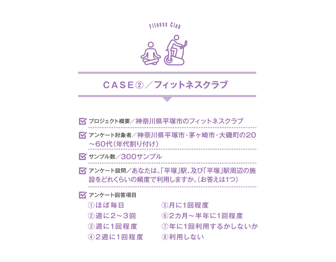 フィットネスクラブの新店オープン販促において、概ねどこの店舗もアンケート調査を実施する場合が多いが、【CASE②】のプロジェクトは平塚というエリア特性上、かなりアンケートが重要であった。というのも平塚というエリアは東西が川、南側が海に囲まれている陸の孤島。そんなエリアで会員を募集した際にしっかりと川を越えて利用してくれるのかが広告を展開する上でも重要なポイントだったためだ。そのため、判断材料の1つとして【CASE②】のように駅の利用頻度に関するアンケートを実施した。こちらは全体の割合よりも利用頻度の多い層がどのエリアまで伸びるかが重要であったため回答者の居住地(町丁目単位)と照らし合わせて、そのエリアを検証した。