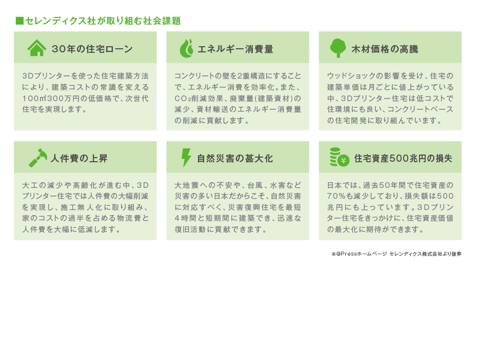 また価格面以外の大きなメリットで言えば工期時間があげられる。例えば上記のセレンディクス社の3Dプリンター住宅は44時間30分で竣工することに成功。通常は購入してから実際に引き渡しがされるまで1年以上空いてしまうこともあるが、3Dプリンター住宅は購入してから2日後には手に入る点は大きな特徴と言えるだろう。