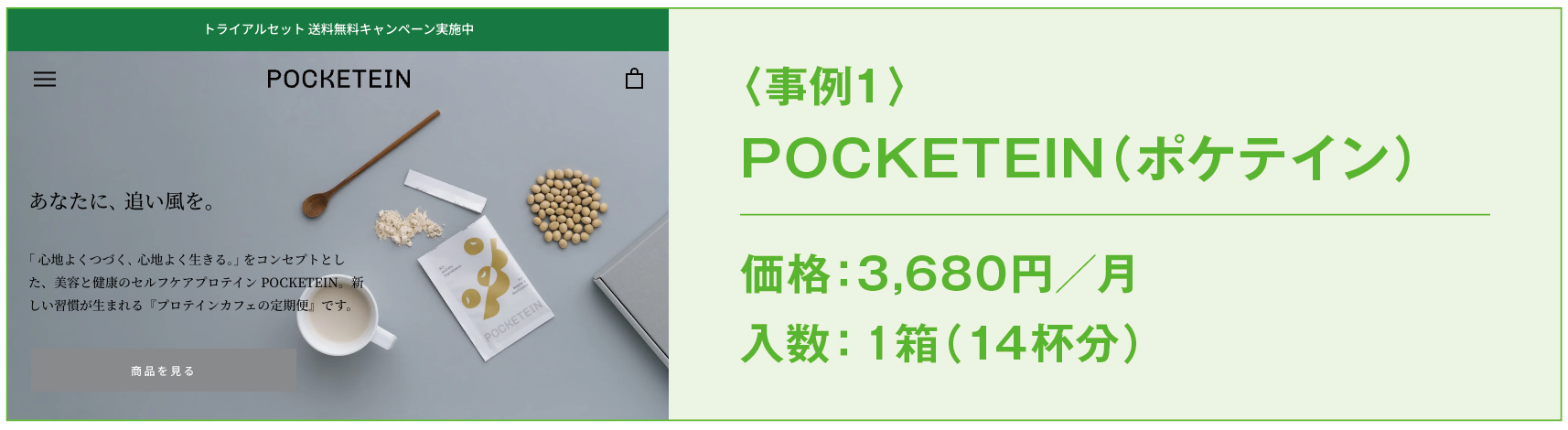 POCKETEINは2022年の7月にサービスを開始した、美容と健康をテーマに女性メインターゲットのサブスクリプションサービスだ。タイプはソイプロテインであり、6種類のフレーバーから2種類のフレーバーをユーザーは選んで定期便として家に送付してもらうことができる。販売会社のジョー・リテイリング株式会社は長くプロテインを続けてもらうことを目的にサービスを開始し、サブスク形態というだけでなくカップに溶かせる個包装形式にすることで職場など家以外の場所でも手軽に摂取できる仕様になっているのが特徴的だ。