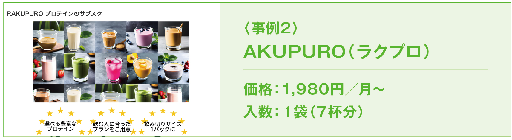 RAKUPUROは2023年の8月にサービスを開始。POCKETEINと違い種類が豊富なのが特徴の1つでソイプロテイン以外にホエイプロテインやBCAAなどから毎月ユーザーは選ぶことが出来る。また都度購入する体験との大きな差別化としてLINEを活用しいつでもプロテインの相談が可能というサービス付だ。すなわち「どのプロテインを選べば良いかわからない」ユーザーにとっても適切なアドバイスが可能になっている。