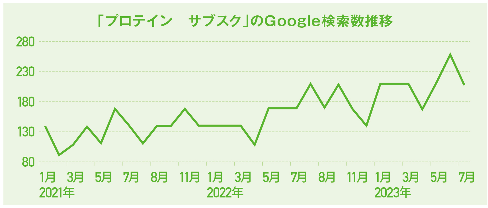 豊富な種類と手軽さが魅力のサブスクだが、そこで気になるのはそもそも需要があるのか否かだ。実際に「プロテイン サブスク」というキーワードの検索推移を調べてみた。すると2022年の中旬を境にして、徐々に検索数が伸びていることがわかる。既述したサービスが狙う「プロテインを続けたいけどなかなか続かない」「どのプロテインを選べば良いかわからない」という需要が一定数あることがわかる。もし今後も同様のサービスが生まれていけば更に検索数は伸びていく可能性もあるだろう。更に将来的にはフィットネスを運営する企業がジムの契約にオプションでプロテインを組み込むなど同じウェルネス市場内でも相乗効果が見込めるようなプランも世に出始める可能性も考えられる。今後プロテインはサブスクが当たり前になるのか、一時的な話題性で終わってしまうのか今後も動向に注目していきたい。