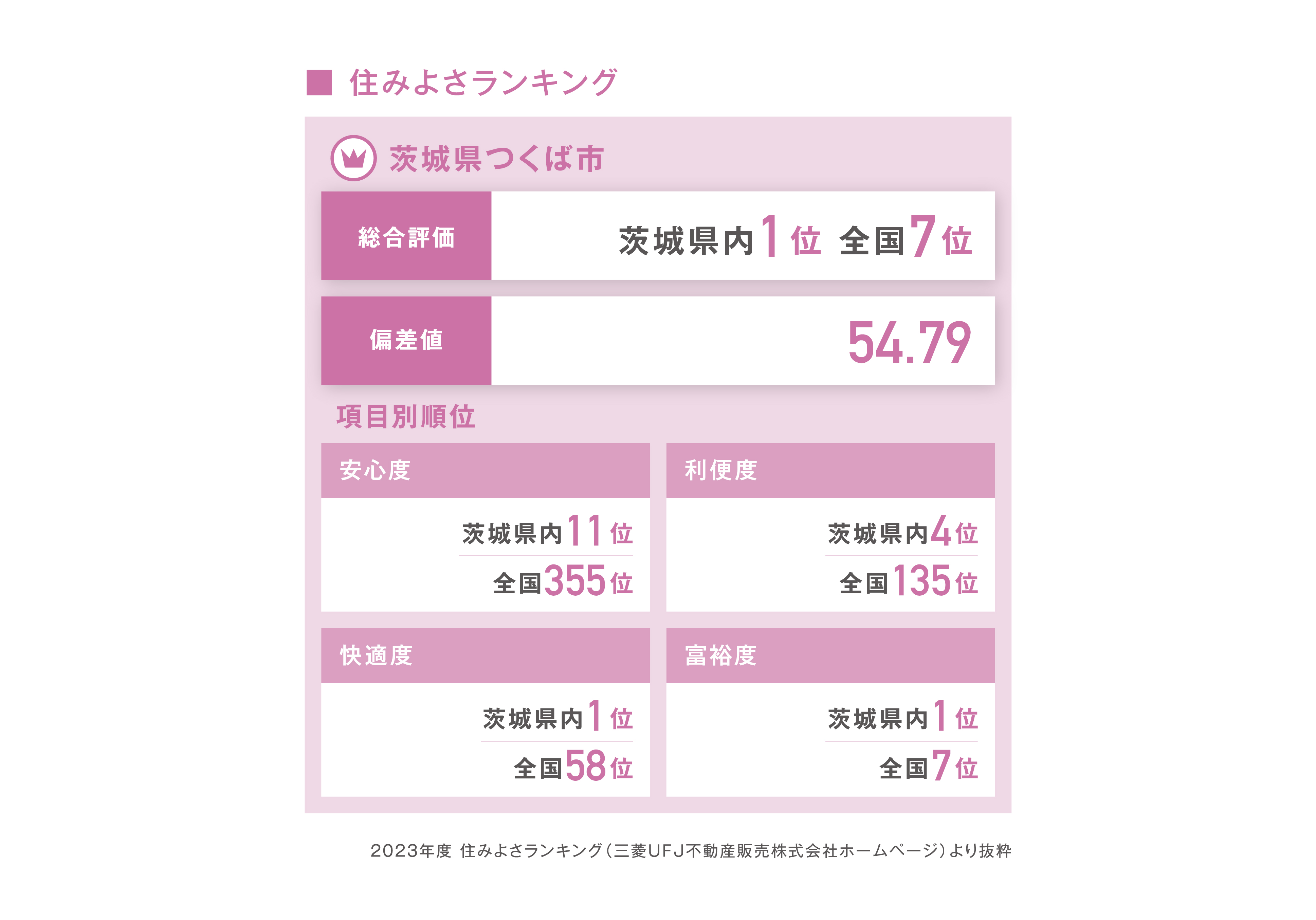 三菱UFJ不動産販売株式会社が1993年から毎年公表している「住みよさランキング」をご存じだろうか。これは、全国792市と東京20区(千代田区・中央区・港区を除く)を合計した812市区を対象に住みよさを表す4つの指標について偏差値を算出し、その平均値を総合評価として順位付けしているものだ。2023年度の「住みよさランキング」によると、つくば市の総合評価は茨城県内で第1位、全国では第7位の高評価を得ている。過去のランキングでは2019年度全国64位、2021年度全国20位であったため、驚異的なスピードで評価を上げていることが分かる。先述した4つの指標には「安心度」「利便度」「快適度」「富裕度」があり、つくば市の総合評価を押し上げた項目は総合評価と同順位を獲得している「富裕度」である。