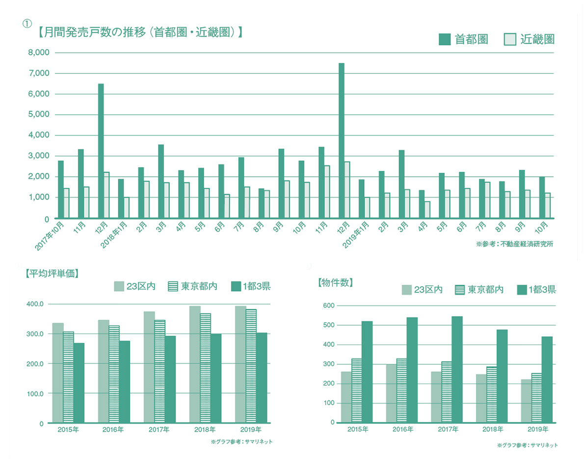 ①月間発売戸数の推移・平均坪単価位の推移・物件数の推移