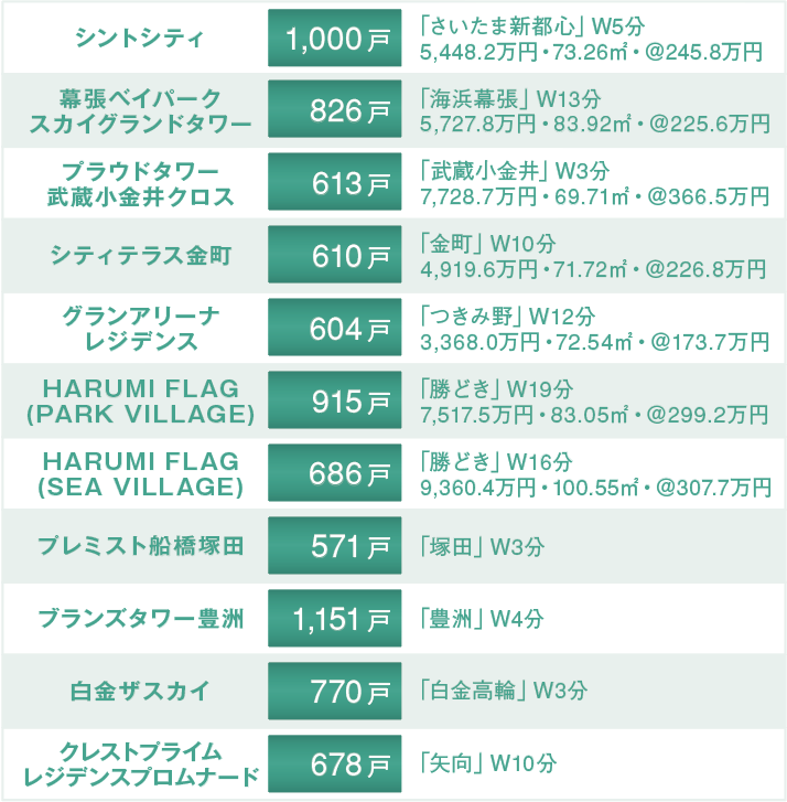 上記がその詳細だが中でも最注目は東京オリンピック選手村として活用された後に供給される「HARUMI FLAG」だ。今年8月から「PARK VILLAGE」と「SEA VILLAGE」の2棟計600戸が発売され、公式HP登録者数は1,500組超にまで上り、レインボーブリッジが望める住戸(PARK VILLAGE・14階・10,960万円)は倍率71倍の人気ぶりを見せた。また購入者の居住地も半数は中広域からと話題性に富んでいることが伺える。そんな「HARUMI FLAG」以外にも業務核都市として開発が進む「さいたま新都心」や「海浜幕張」には「シントシティ」、「幕張ベイパークスカイグランドタワー」がそれぞれ発売。11月にオープンした「グランベリーパーク」近くには「グランアリーナレジデンス」が発売。その他の物件を見ても2019年は再開発一体型やそれにあやかった超大規模物件が多かった新築マンション市場であった。