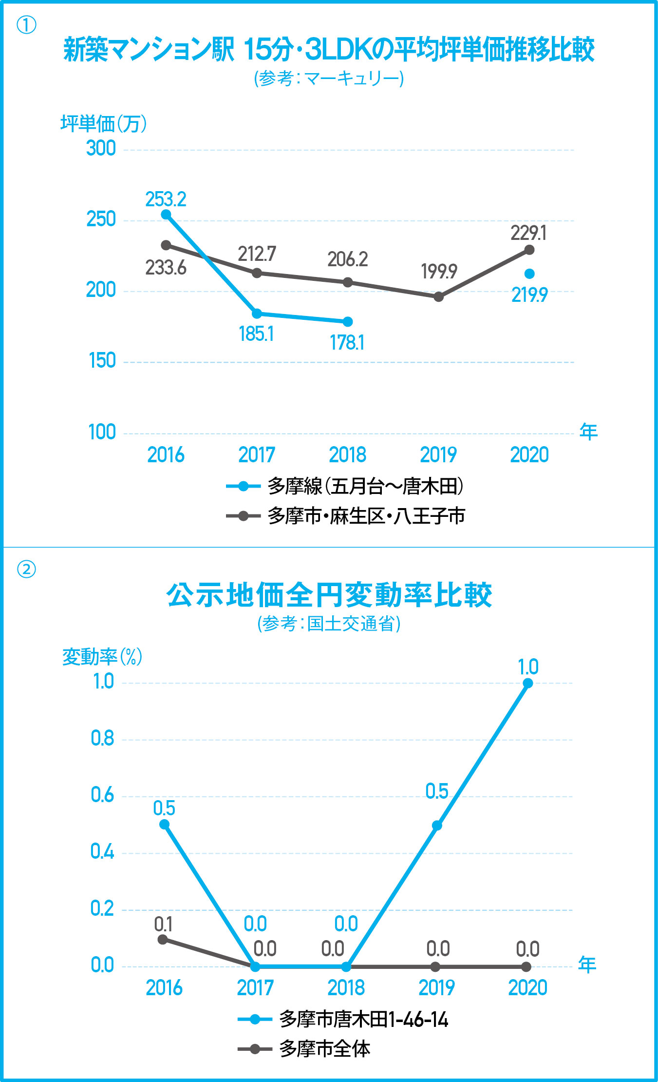 結論、 グラフ①・②からわかるように都心直通有無という程度ではマンション価格も公示地価も大きく変化している様子は見られない。 マンション価格はダイヤ改正前の 2017 年からダイヤ改正をして3年が経過した 2020 年までの増減を見ると沿線=+23.4%に対し、沿線の運行する行政区全体では+11.1%と増加幅が沿線の方が大きい。公示地価も同様であり、唐木田 1 丁目地点の地価は 2017 年から 2020 年まで概ね横ばい~1%の前年増に対し、多摩市全体は横ばいとなっている。