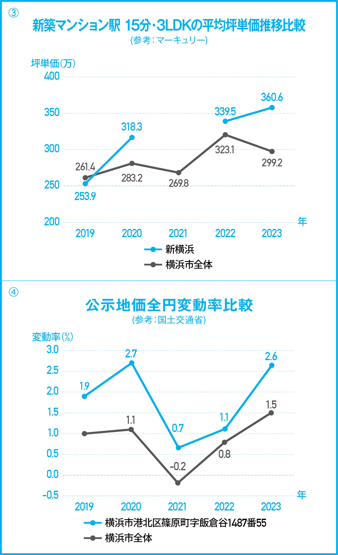 こちらは東急・相鉄新横浜線によって資産価値にも大きく影響を受けたといえる。 実際に大きな影響のあった新横浜と横浜市全体で比較すると、2023 年の新築マンション平均坪単価前年比は新横浜=+6.2%・横浜市全体は=-7.4%。更に公示地価はわかりやすく、新横浜線の先駆けとして 2019 年に羽沢横浜国大が誕生し埼京線が延伸したがその翌年にあたる2020 年と、2023 年の地価上昇率は横浜市全体と比較しても増加幅が大きいことが分かる。