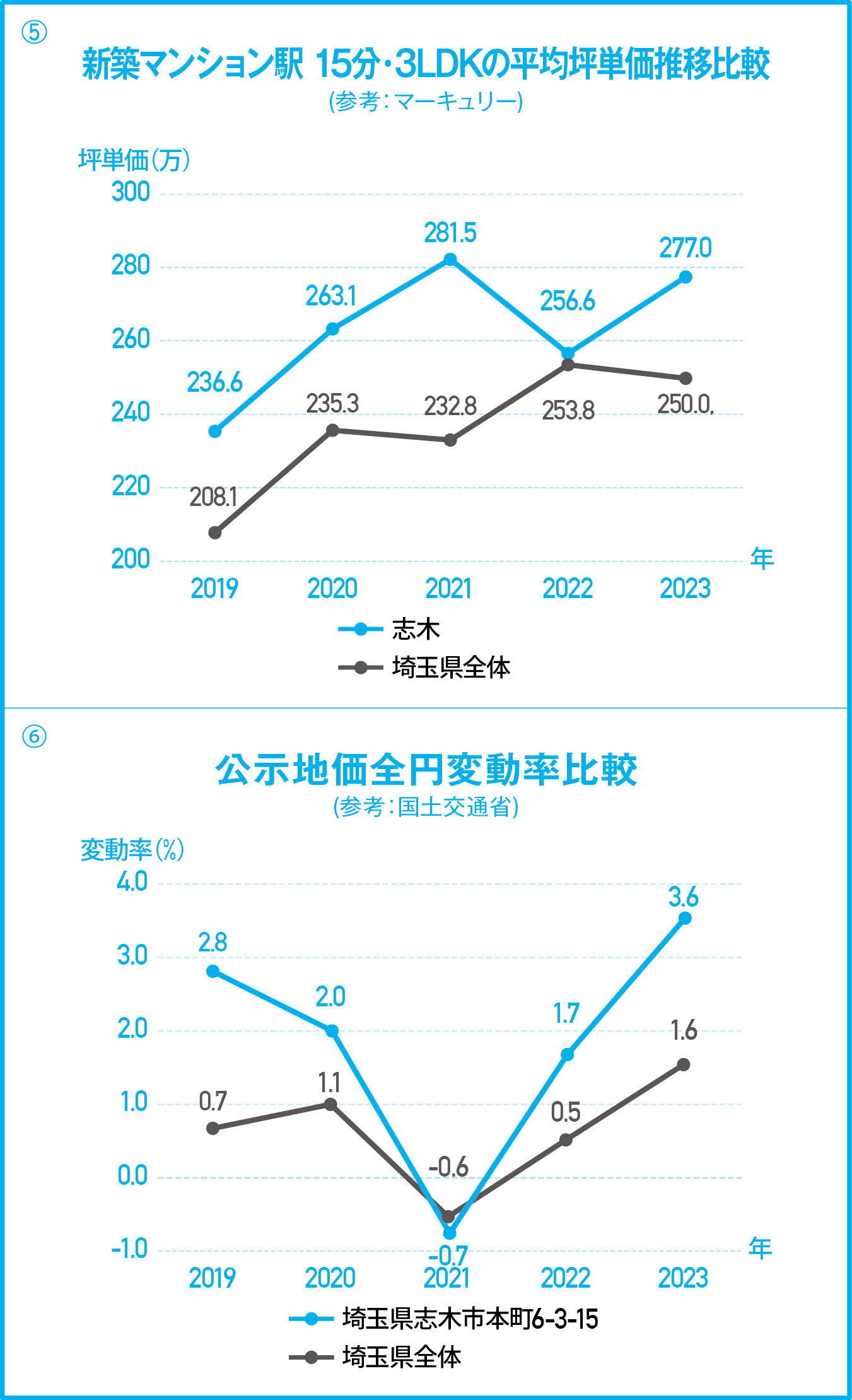 志木駅 (行政区面積が小さいため埼玉県全体と比較) は東上線快速急行駅ではなくなった点は大きく影響していなさそうだ。2023 年の新築マンションの平均坪単価も埼玉県全体が横ばいなのに対し上昇、公示地価も埼玉県全体の上り幅以上の増加となっている。