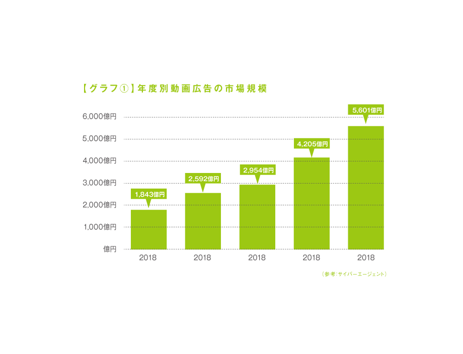 広告において動画媒体を活用しているか否かは事業主によって様々だが、不動産に限らず市場全体はどのように推移しているのだろうか。サイバーエージェントが毎年出している動画広告の市場規模を表すデータ(グラフ1)によると2018年当時は約1,800億円だったものが、2022年には約5,600億円にまで成長している。コロナ禍での家時間の増加や5Gの到来といった社会的な背景がこの規模に成長させていることが考えられる。また動画媒体を展開する企業側の取り組みが活発であることも要因の1つだ。例えば中国初のショート動画に特化したSNSサービス「Tik Tok」はここ5年間で急成長を遂げて昨今はメジャーな動画媒体の1つになった。