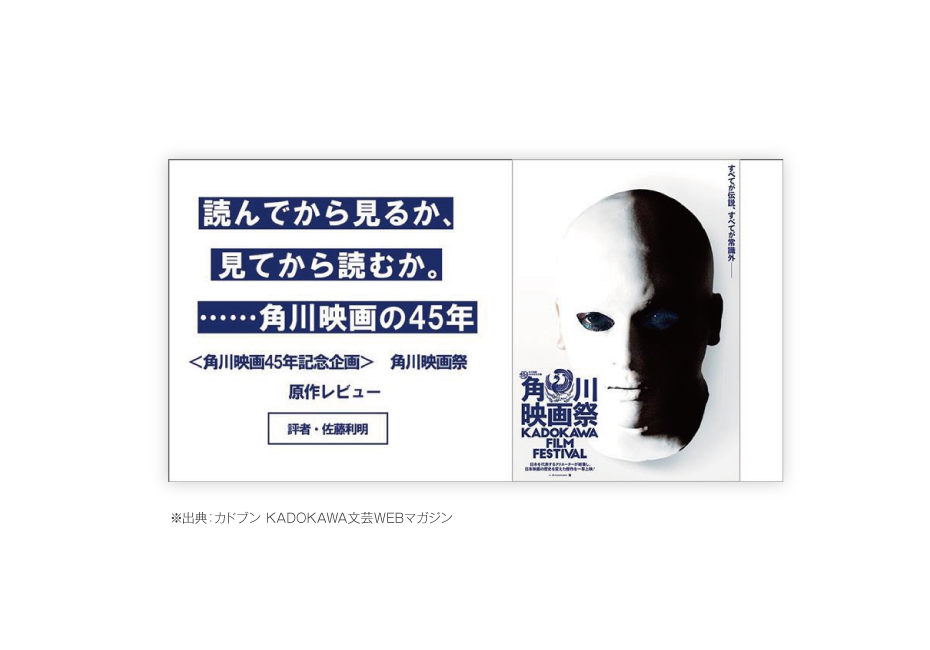 で、実は今回記載したかったのが、これを見ていて思い出した角川映画の宣伝手法。もともと角川文庫の売上向上のため、映画を利用する目的で映画事務所を作り、また当時はまだ映画vsTV(お互いライバル視していた状況。映画の宣伝はポスターや新聞がメインでした)の世相の中でTVCMを使い、映画と書籍を売り込む相乗効果を狙った日本におけるメディアミックスの先駆けといえる手法で成功してます。当時各メディアに新風を起こしたこの宣伝手法は、昨今の宣伝から見ても当時いかに“革新”といえる出来事だったとかと感じ取れます。「読んでから観るか、観てから読むか」のキャッチコピーや書籍ブックカバーに映画の画像を入れるなど、現在当たり前になってることの走りを取り込んだ当時としての斬新さ!未来の日常となる“先見の名”を広告に携わる私たちも考えないといけないと感じています。