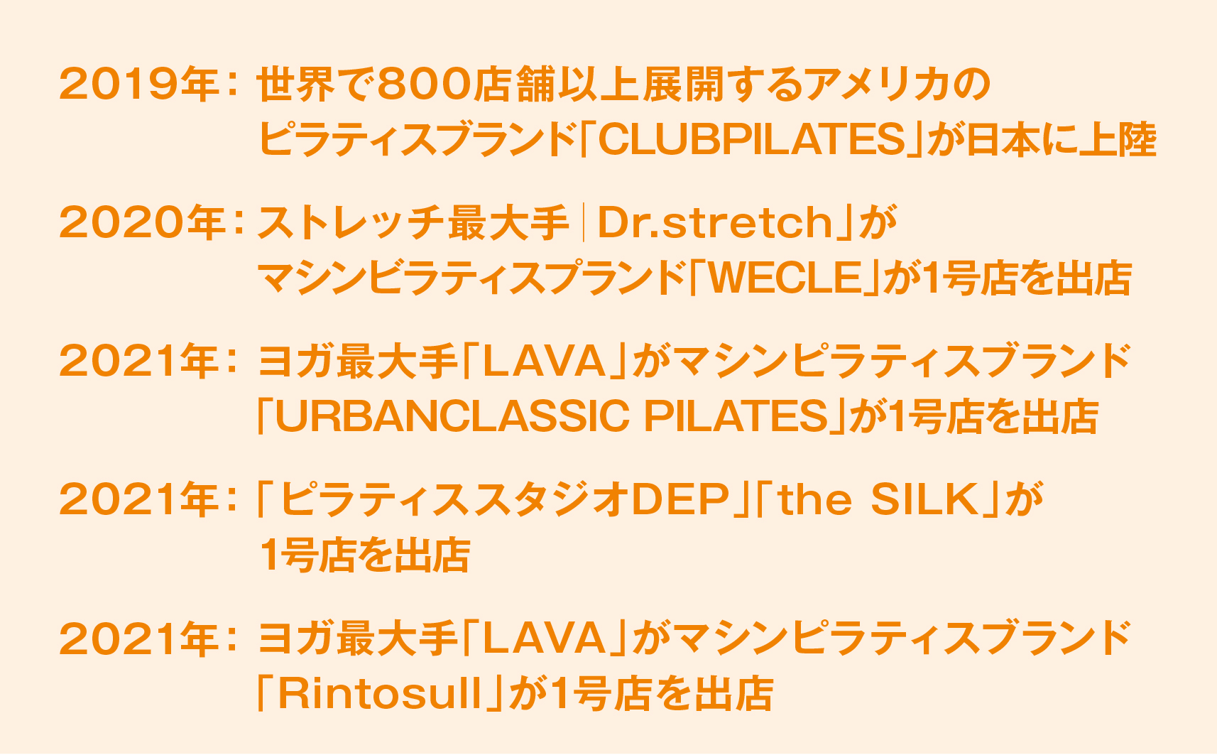 2,000年以降、アメリカでヨガ&ピラティスブームが起こりそこから日本にもピラティスが広まり始めました。2010年代中盤まではホットヨガが全盛で、LAVA社がどんどん店舗数を増やしている状態でしたが、「日本のヨガマーケット調査2017」によると日本におけるピラティスの実践者が増えてきており、ブームになってきているとの記載があります。その記載通り、その後2019年-2022年の間に一気にピラティスブランドが立ち上がり現在の市場まで成長しています。
