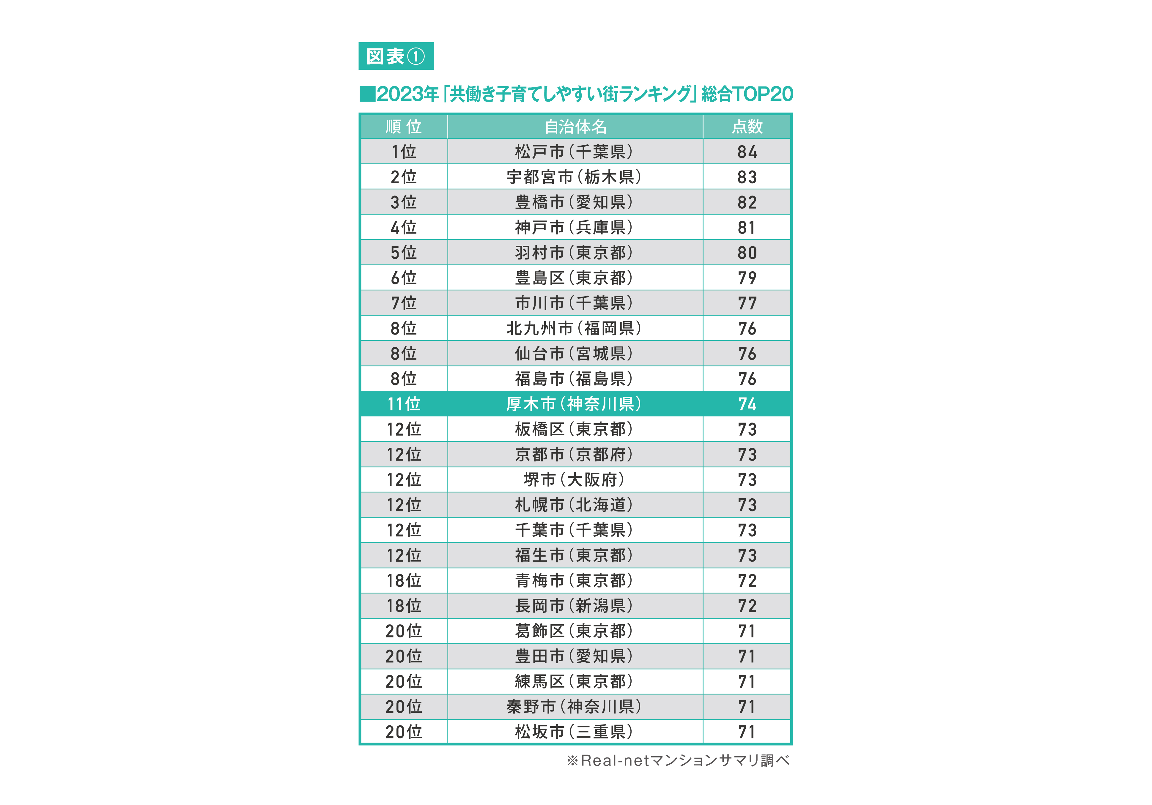 今回は、その「共働き子育てしやすい街ランキング」において、毎年のようにランキングの常連であり、2023年度版では全国第11位(図表①)、神奈川県内では2021年度~2023年度まで3年連続で神奈川県内第1位に選出されている厚木市にフォーカスし、このランキングで神奈川県内トップを維持し続ける理由を探りながら、ファミリータイプの新築マンションの売れ行きや、今後の市場動向の可能性を考察していきたい。