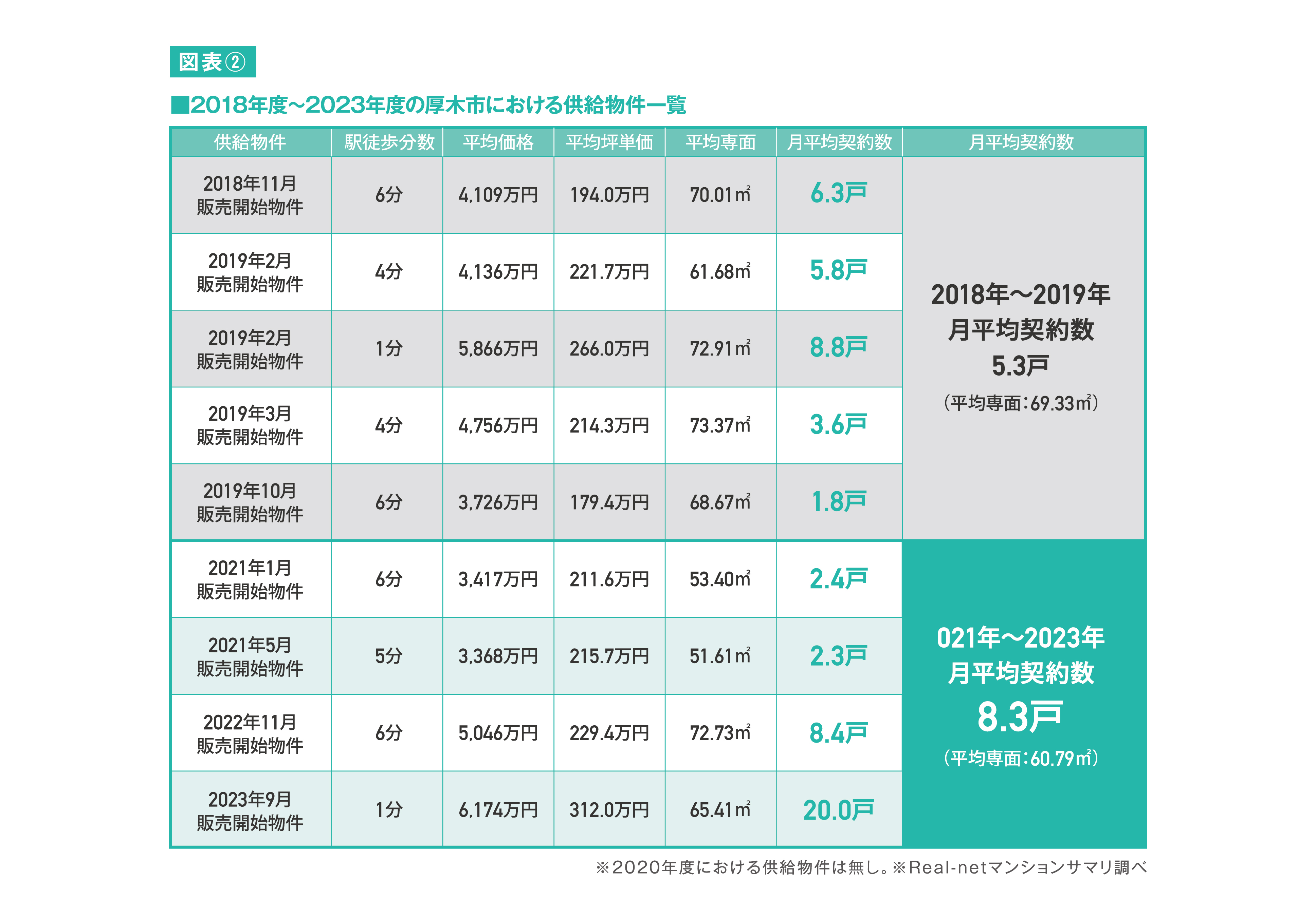 そんな子育て環境に定評のある厚木市だが、実際にファミリーに人気のエリアなのか否かを新築マンション市場から検証していきたい。2018年度~2023年度にかけて供給されたファミリータイプマンションの9物件のデータが図表②である。その中で注目したいのが、月平均契約数だ。2018年度~2019年度の2年間における月平均契約数が5.3戸に対して、「共働き子育てしやすい街ランキング」で神奈川県内第1位となった2021年度~2023年度の直近3年間における月平均契約数は8.3戸と、プラス3戸も伸びていることが分かる。