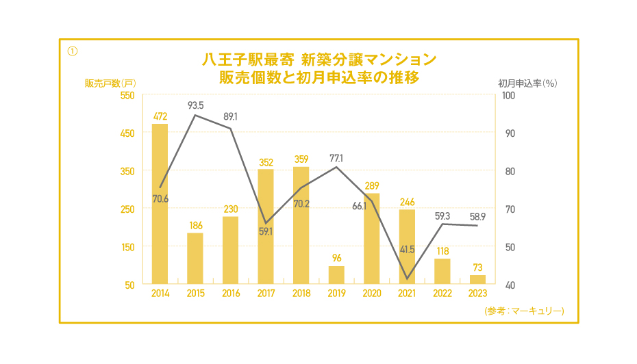 東京都の郊外駅として代表的である「八王子」駅周辺では多くの新築分譲マンションが販売されてきたが2014年-2017年で人気のピークを迎え、現在は不調に陥っている。その証拠に「八王子」駅周辺の新築分譲マンションの初月申込率の推移を見ていくと、2014年-2018年までは平均76.5%だったが、2019年-2023年までは平均60.58%と10pt以上下落している。(グラフ①参照)