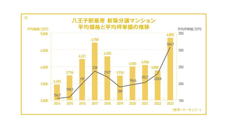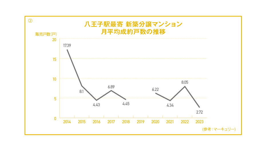 同様に月平均成約戸数を見ていくと2014年に17.39戸であったが2023年は2.72戸まで下落している。(※各年に販売された新築分譲マンションの総戸数を販売期間で割った平均値) 2014年-2018年の好調と言える5年間から、現在では約半数まで落ちてしまった「八王子」駅周辺のマンションの人気について理由を探っていく。