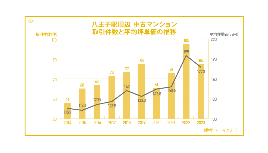 マンション価格が値上がりしているのは首都圏どのエリアも同様だが八王子駅は本格的に価格高騰による新築マンション需要が枯渇しつつあると考えらえる。その証拠に中古マンションなどの選択肢も検討する層が増えてきている。実際に「八王子」駅の中古マンション市況はここ数年で大きく変化しており、2014年と比較すると中古マンションの取引事例は倍近くまで増加している。(グラフ④参照) 新築マンションの高騰により中古マンションの価格も高騰はしているものの、面積や価格を比較すると中古マンションのほうが当然価格は安く、需要が流れていることが見て取れる。