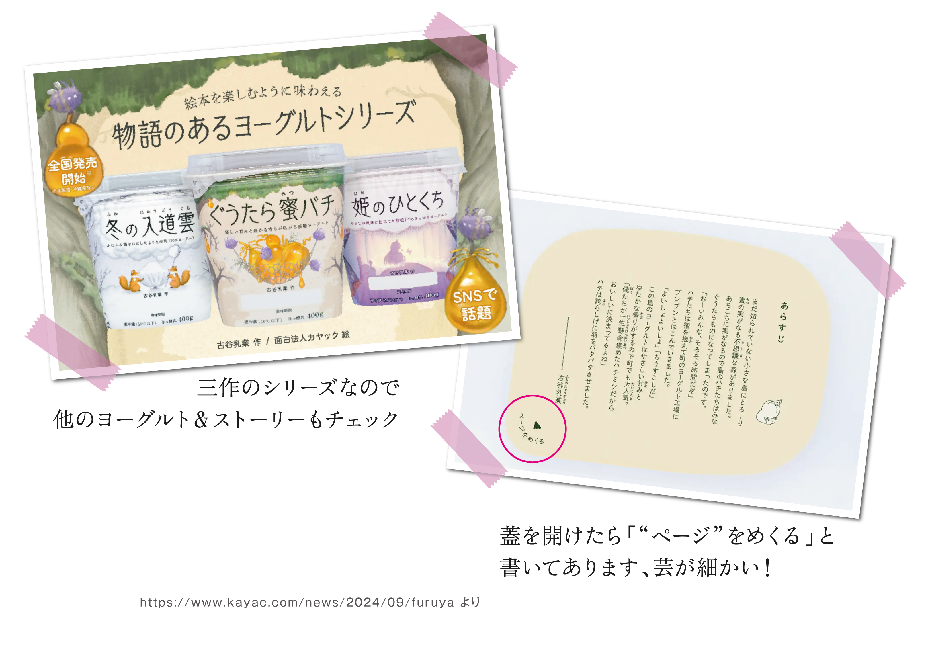 『ぐうたら蜜バチ』は古谷乳業と、個人的に好きな会社でもあります、面白法人カヤックがコラボしてるそうで、牛乳離れが進む子どもたちや、義務感や機能性でヨーグルトを選ぶ大人へ「絵本を読むようにヨーグルトを楽しんで味わって欲しい」という思いから誕生。パッケージの裏側やインナーシールなどにも世界観が散りばめられていて、食べながら思わず読みこんでしまったほど。はちみつの甘さと香りが特長のデザートっぽいヨーグルトだったので、絵本のような優しいイラストの世界観ともマッチしています。健康のため、ではなく「(話題性もあって)かわいいから」とヨーグルトをパケ買いするなんて、新しい体験でした。