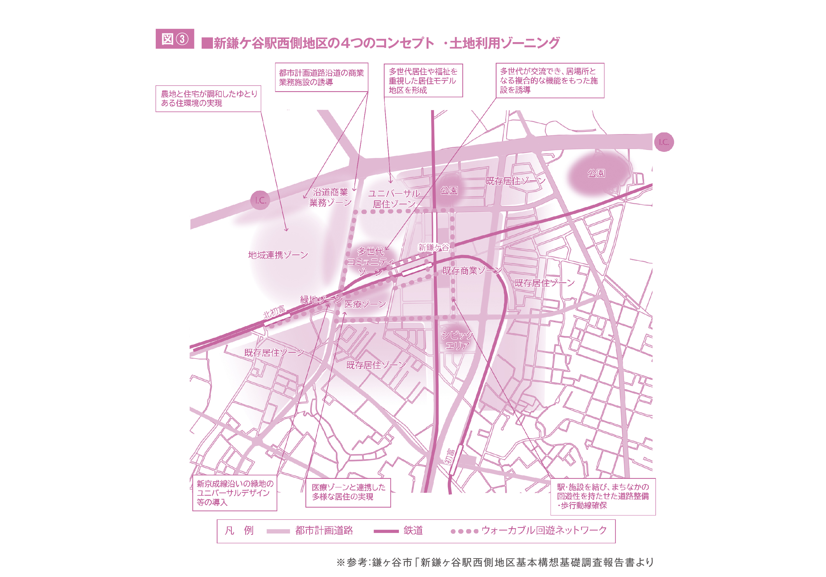 そんな子育て環境に定評があり、交通の利便性や充実した駅前環境が備わっていながら、まだ街としての認知度は高くない鎌ヶ谷市であるが、現在進行中の駅直結複合施設の他に新鎌ヶ谷駅西側地区のまちづくり構想を計画している。内容の中には、これまで市街化を抑制していた農地を主体とするエリアにおける活用法が計画され、「まちなか居住ゾーン」「にぎわい創出ゾーン」「地域連携ゾーン」など、都心居住の促進や農地と住宅が調和した住環境の実現を目指している。【図③】