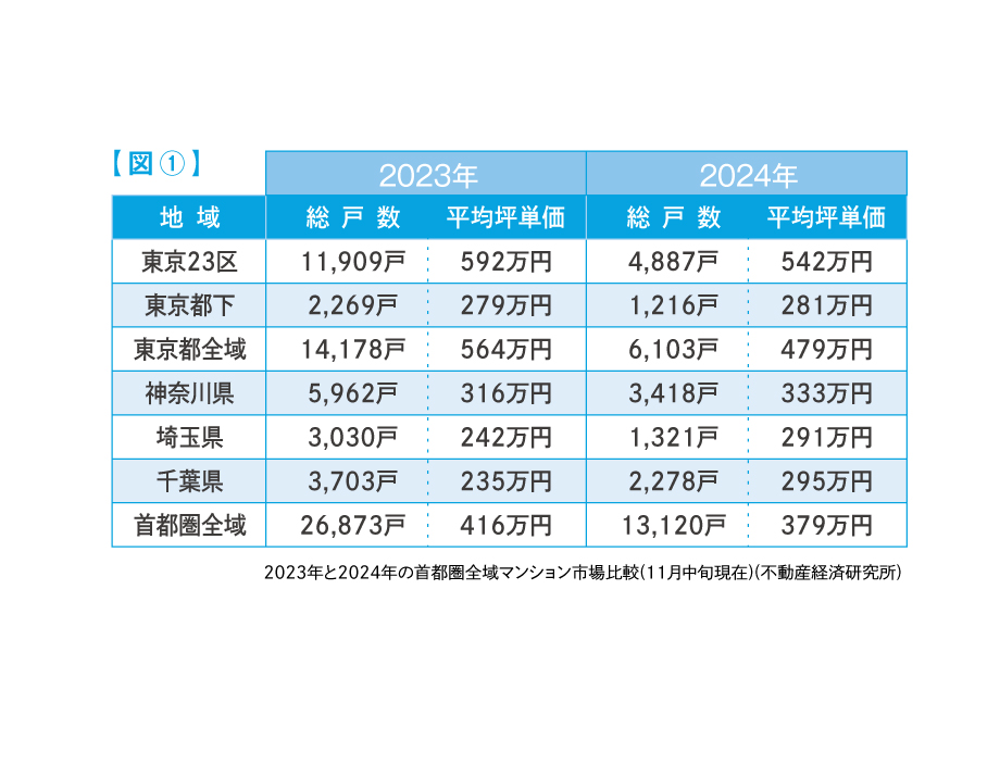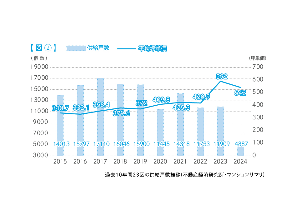特に、これまで小幅に増減を繰り返していた東京23区の供給戸数は2024年、大幅に減少した。23区では昨年までは少なくとも11,000戸程度と、過去10年で10,000戸を切ることは無かったが、2024年は11月中旬現在で4,887戸と、10,000戸に届くことは無さそうである。また、23区の平均坪単価を比較すると、昨年に比べ坪単価は50万円程下落している。【図②】