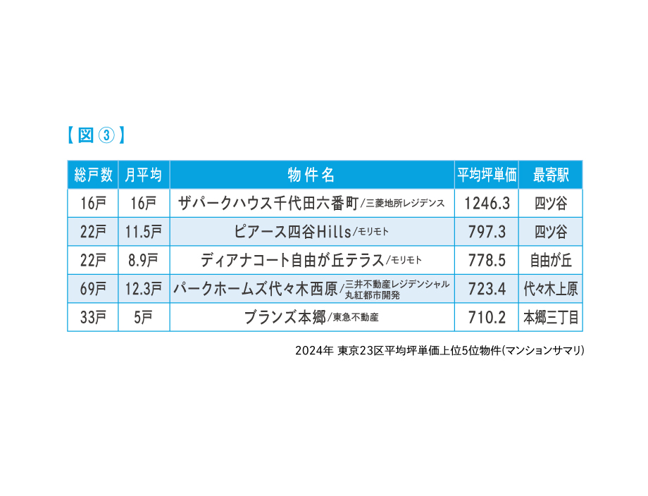 しかし、2023年の平均坪単価には大きなカラクリがあり、三井不動産・三菱地所が「三田ガーデンヒルズ」を総販売戸数952戸、最高価格45億円、平均坪単価1,356万円で販売し、23区の平均坪単価を80万円程引き上げていた。対する2024年は「ザ・パークハウス千代田六番町(三菱地所)」が総販売戸数16戸、最高価格4億9900万、平均坪単価1,246万円で都内最高額であったが、戸数が少ないため2024年の平均価格を大幅に引き上げるまでには至らなかった。つまり、2023年の平均坪単価は「三田ガーデンヒルズ」の販売を考慮しなかった場合512万円程度であり、542万円の2024年は昨年より30万円程上昇(6%増)しているのである。故に現状の23区マンション市場は供給戸数が大幅に減少し、価格は上昇しているのである。ちなみに話は少々それるが、2024年の23区で販売されていた中で平均坪単価の上位を確認していくと、高額ながらも月平均の販売の進捗は好調な物件が多く見られる。【図③】