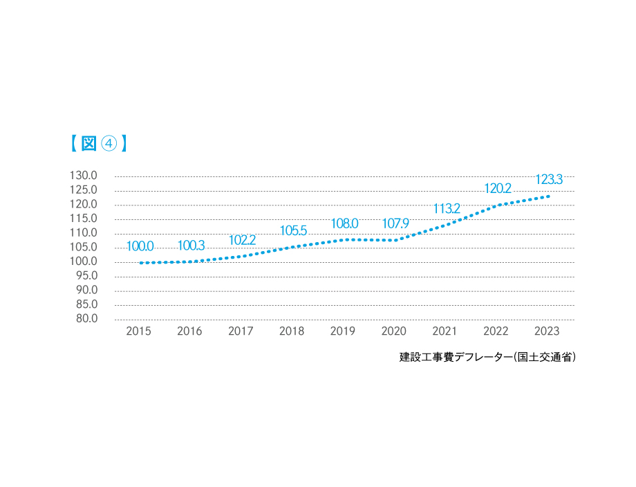 今年、不動産業界に限らず大きな話題を呼んでいた「2024年問題」。この問題は、端的に説明をすると建築費と輸送費が高騰しますよ、と言った内容である。マンションデベロッパーはダイレクトにこの建築費高騰の影響を受け、価格を高騰させざるを得ないのである。【図④】